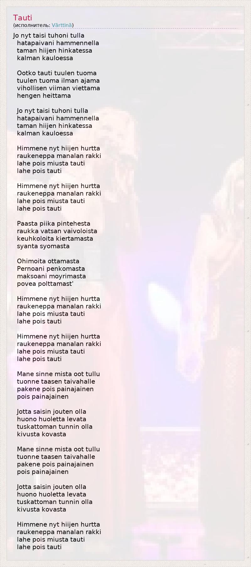 Jo nyt taisi tuhoni tulla hatapaivani hammennella taman hiijen hinkatessa kalman kauloessa Ootko tauti tuulen tuoma tuulen tuoma ilman ajama vihollisen viiman viettama hengen heittama Jo nyt taisi tuhoni tulla hatapaivani hammennella taman hiijen hinkatessa kalman kauloessa Himmene nyt hiijen hurtta raukeneppa manalan rakki lahe pois miusta tauti lahe pois tauti Himmene nyt hiijen hurtta raukeneppa manalan rakki lahe pois miusta tauti lahe pois tauti Paasta piika pintehesta raukka vatsan vaivoloista keuhkoloita kiertamasta syanta syomasta Ohimoita ottamasta Pernoani penkomasta maksoani moyrimasta povea polttamast' Himmene nyt hiijen hurtta raukeneppa manalan rakki lahe pois miusta tauti lahe pois tauti Himmene nyt hiijen hurtta raukeneppa manalan rakki lahe pois miusta tauti lahe pois tauti Mane sinne mista oot tullu tuonne taasen taivahalle pakene pois painajainen pois painajainen Jotta saisin jouten olla huono huoletta levata tuskattoman tunnin olla kivusta kovasta Mane sinne mista oot tullu tuonne taasen taivahalle pakene pois painajainen pois painajainen Jotta saisin jouten olla huono huoletta levata tuskattoman tunnin olla kivusta kovasta Himmene nyt hiijen hurtta raukeneppa manalan rakki lahe pois miusta tauti lahe pois tauti
