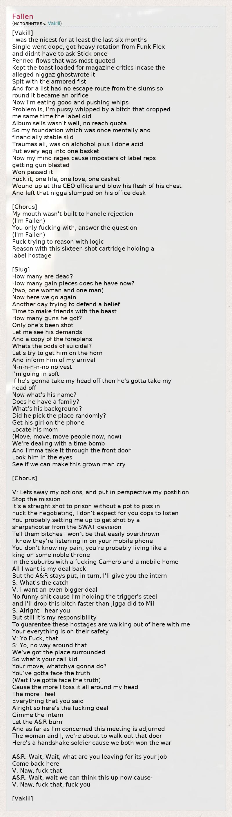 [Vakill] I was the nicest for at least the last six months Single went dope, got heavy rotation from Funk Flex and didnt have to ask Stick once Penned flows that was most quoted Kept the toast loaded for magazine critics incase the alleged niggaz ghostwrote it Spit with the armored fist And for a list had no escape route from the slums so round it became an orifice Now I'm eating good and pushing whips Problem is, I'm pussy whipped by a bitch that dropped me same time the label did Album sells wasn't well, no reach quota So my foundation which was once mentally and financially stable slid Traumas all, was on alchohol plus I done acid Put every egg into one basket Now my mind rages cause imposters of label reps getting gun blasted Won passed it Fuck it, one life, one love, one casket Wound up at the CEO office and blow his flesh of his chest And left that nigga slumped on his office desk [Chorus] My mouth wasn't built to handle rejection (I'm Fallen) You only fucking with, answer the question (I'm Fallen) Fuck trying to reason with logic Reason with this sixteen shot cartridge holding a label hostage [Slug] How many are dead? How many gain pieces does he have now? (two, one woman and one man) Now here we go again Another day trying to defend a belief Time to make friends with the beast How many guns he got? Only one's been shot Let me see his demands And a copy of the foreplans Whats the odds of suicidal? Let's try to get him on the horn And inform him of my arrival N-n-n-n-n-no no vest I'm going in soft If he's gonna take my head off then he's gotta take my head off Now what's his name? Does he have a family? What's his background? Did he pick the place randomly? Get his girl on the phone Locate his mom (Move, move, move people now, now) We're dealing with a time bomb And I'mma take it through the front door Look him in the eyes See if we can make this grown man cry [Chorus] V: Lets sway my options, and put in perspective my postition Stop the mission It's a straight shot to prison without a pot to piss in Fuck the negotiating, I don't expect for you cops to listen You probably setting me up to get shot by a sharpshooter from the SWAT devision Tell them bitches I won't be that easily overthrown I know they're listening in on your mobile phone You don't know my pain, you're probably living like a king on some noble throne In the suburbs with a fucking Camero and a mobile home All I want is my deal back But the A&R stays put, in turn, I'll give you the intern S: What's the catch V: I want an even bigger deal No funny shit cause I'm holding the trigger's steel and I'll drop this bitch faster than Jigga did to Mil S: Alright I hear you But still it's my responsibility To guarentee these hostages are walking out of here with me Your everything is on their safety V: Yo Fuck, that S: Yo, no way around that We've got the place surrounded So what's your call kid Your move, whatchya gonna do? You've gotta face the truth (Wait I've gotta face the truth) Cause the more I toss it all around my head The more I feel Everything that you said Alright so here's the fucking deal Gimme the intern Let the A&R burn And as far as I'm concerned this meeting is adjurned The woman and I, we're about to walk out that door Here's a handshake soldier cause we both won the war A&R: Wait, Wait, what are you leaving for its your job Come back here V: Naw, fuck that A&R: Wait, wait we can think this up now cause- V: Naw, fuck that, fuck you [Vakill]