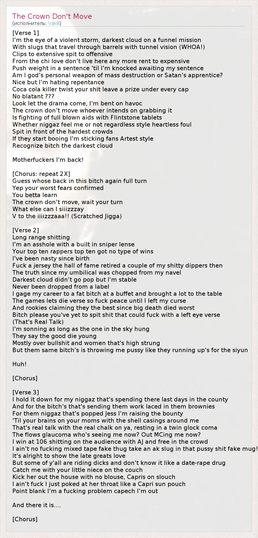 [Verse 1] I'm the eye of a violent storm, darkest cloud on a funnel mission With slugs that travel through barrels with tunnel vision (WHOA!) Clips to extensive spit to offensive From the chi love don't live here any more rent to expensive Push weight in a sentence 'til I'm knocked awaiting my sentence Am I god's personal weapon of mass destruction or Satan's apprentice? Nice but I'm hating repentance Coca cola killer twist your shit leave a prize under every cap No blatant ??? Look let the drama come, I'm bent on havoc The crown don't move whoever intends on grabbing it Is fighting of full blown aids with Flintstone tablets Whether niggaz feel me or not regardless style heartless foul Spit in front of the hardest crowds If they start booing I'm sticking fans Artest style Recognize bitch the darkest cloud Motherfuckers I'm back! [Chorus: repeat 2X] Guess whose back in this bitch again full turn Yep your worst fears confirmed You betta learn The crown don't move, wait your turn What else can I siiizzzay V to the iiiizzzaaa!! (Scratched Jigga) [Verse 2] Long range shitting I'm an asshole with a built in sniper lense Your top ten rappers top ten got no type of wins I've been nasty since birth Fuck a jersey the hall of fame retired a couple of my shitty dippers then The truth since my umbilical was chopped from my navel Darkest cloud didn't go pop but I'm stable Never been dropped from a label I gage my career to a fat bitch at a buffet and brought a lot to the table The games lets die verse so fuck peace until I left my curse And rookies claiming they the best since big death died worst Bitch please you've yet to spit shit that could fuck with a left eye verse (That's Real Talk) I'm sonning as long as the one in the sky hung They say the good die young Mostly over bullshit and women that's high strung But them same bitch's is throwing me pussy like they running up's for the siyun Huh! [Chorus] [Verse 3] I hold it down for my niggaz that's spending there last days in the county And for the bitch's that's sending them work laced in them brownies For them niggaz that's popped Jess I'm raising the bounty 'Til your brains on your moms with the shell casings around me That's real talk with the real chalk on ya, resting in a twin glock coma The flows glaucoma who's seeing me now? Out MCing me now? I win at 106 shitting on the audience with AJ and free in the crowd I ain't no fucking mixed tape fake thug take an ak slug in that pussy shit fake mug! It's alright to show the late greats love But some of y'all are riding dicks and don't know it like a date-rape drug Catch me with your little niece on the couch Kick her out the house with no blouse, Capris on slouch I ain't fuck I just poked at her throat like a Capri sun pouch Point blank I'm a fucking problem capech I'm out And there it is.... [Chorus]