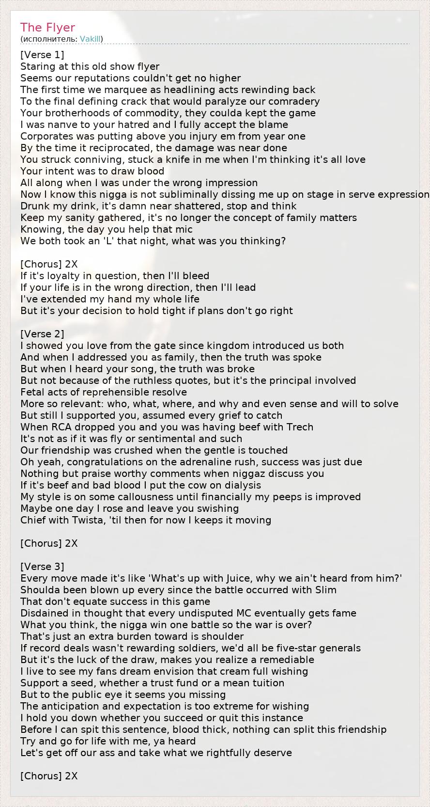 [Verse 1] Staring at this old show flyer Seems our reputations couldn't get no higher The first time we marquee as headlining acts rewinding back To the final defining crack that would paralyze our comradery Your brotherhoods of commodity, they coulda kept the game I was naпve to your hatred and I fully accept the blame Corporates was putting above you injury em from year one By the time it reciprocated, the damage was near done You struck conniving, stuck a knife in me when I'm thinking it's all love Your intent was to draw blood All along when I was under the wrong impression Now I know this nigga is not subliminally dissing me up on stage in serve expression Drunk my drink, it's damn near shattered, stop and think Keep my sanity gathered, it's no longer the concept of family matters Knowing, the day you help that mic We both took an 'L' that night, what was you thinking? [Chorus] 2X If it's loyalty in question, then I'll bleed If your life is in the wrong direction, then I'll lead I've extended my hand my whole life But it's your decision to hold tight if plans don't go right [Verse 2] I showed you love from the gate since kingdom introduced us both And when I addressed you as family, then the truth was spoke But when I heard your song, the truth was broke But not because of the ruthless quotes, but it's the principal involved Fetal acts of reprehensible resolve More so relevant: who, what, where, and why and even sense and will to solve But still I supported you, assumed every grief to catch When RCA dropped you and you was having beef with Trech It's not as if it was fly or sentimental and such Our friendship was crushed when the gentle is touched Oh yeah, congratulations on the adrenaline rush, success was just due Nothing but praise worthy comments when niggaz discuss you If it's beef and bad blood I put the cow on dialysis My style is on some callousness until financially my peeps is improved Maybe one day I rose and leave you swishing Chief with Twista, 'til then for now I keeps it moving [Chorus] 2X [Verse 3] Every move made it's like 'What's up with Juice, why we ain't heard from him?' Shoulda been blown up every since the battle occurred with Slim That don't equate success in this game Disdained in thought that every undisputed MC eventually gets fame What you think, the nigga win one battle so the war is over? That's just an extra burden toward is shoulder If record deals wasn't rewarding soldiers, we'd all be five-star generals But it's the luck of the draw, makes you realize a remediable I live to see my fans dream envision that cream full wishing Support a seed, whether a trust fund or a mean tuition But to the public eye it seems you missing The anticipation and expectation is too extreme for wishing I hold you down whether you succeed or quit this instance Before I can spit this sentence, blood thick, nothing can split this friendship Try and go for life with me, ya heard Let's get off our ass and take what we rightfully deserve [Chorus] 2X