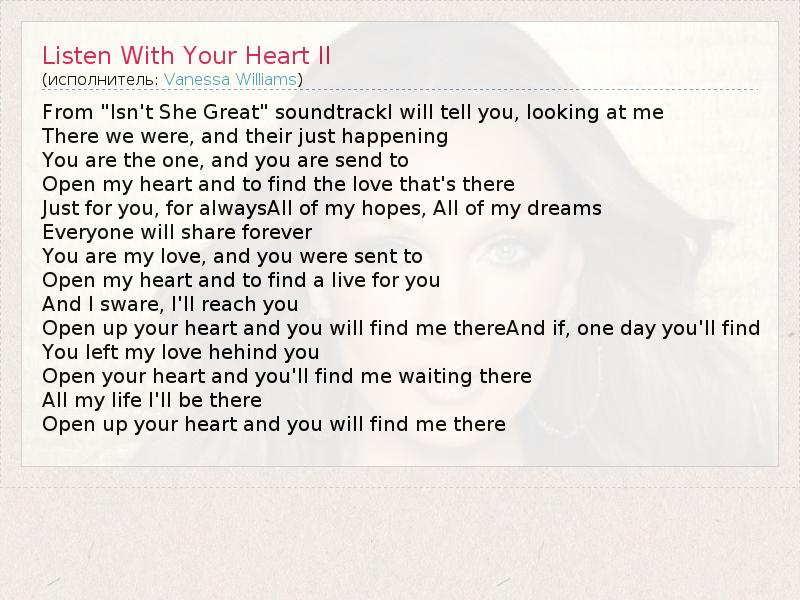 А как ты думаешь, о чем песня "Listen With Your Heart II" ?