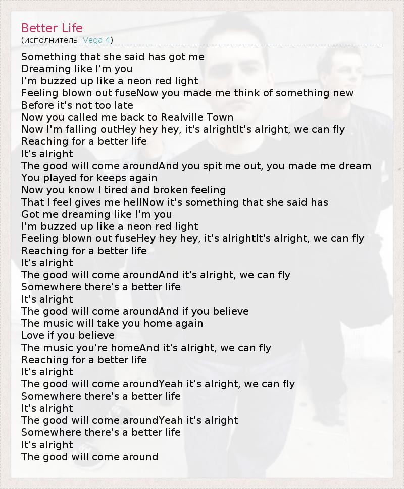 Something that she said has got me Dreaming like I'm you I'm buzzed up like a neon red light Feeling blown out fuseNow you made me think of something new Before it's not too late Now you called me back to Realville Town Now I'm falling outHey hey hey, it's alrightIt's alright, we can fly Reaching for a better life It's alright The good will come aroundAnd you spit me out, you made me dream You played for keeps again Now you know I tired and broken feeling That I feel gives me hellNow it's something that she said has Got me dreaming like I'm you I'm buzzed up like a neon red light Feeling blown out fuseHey hey hey, it's alrightIt's alright, we can fly Reaching for a better life It's alright The good will come aroundAnd it's alright, we can fly Somewhere there's a better life It's alright The good will come aroundAnd if you believe The music will take you home again Love if you believe The music you're homeAnd it's alright, we can fly Reaching for a better life It's alright The good will come aroundYeah it's alright, we can fly Somewhere there's a better life It's alright The good will come aroundYeah it's alright Somewhere there's a better life It's alright The good will come around