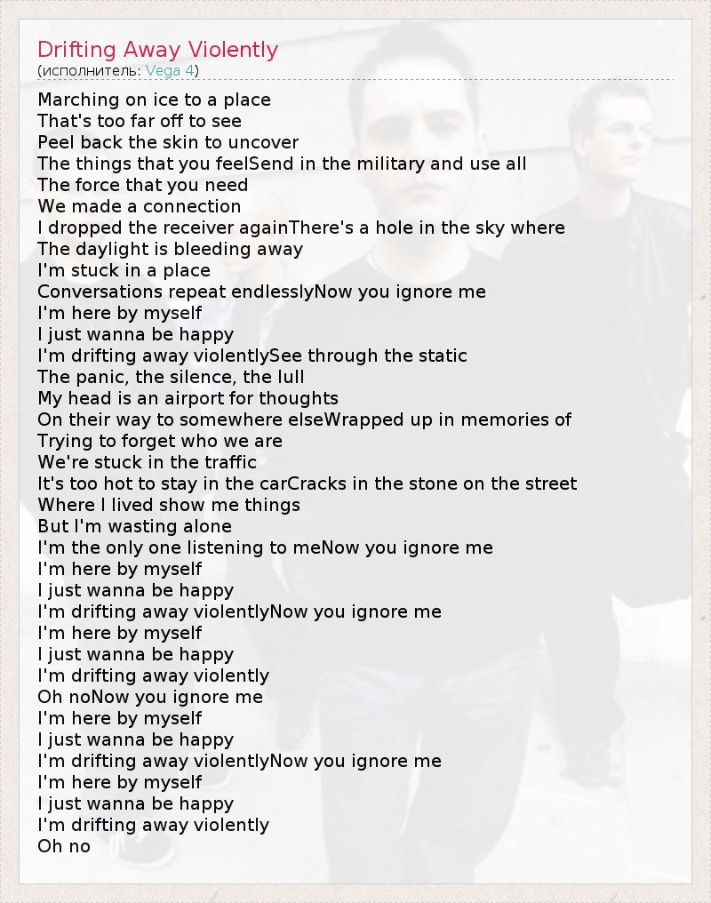 Marching on ice to a place That's too far off to see Peel back the skin to uncover The things that you feelSend in the military and use all The force that you need We made a connection I dropped the receiver againThere's a hole in the sky where The daylight is bleeding away I'm stuck in a place Conversations repeat endlesslyNow you ignore me I'm here by myself I just wanna be happy I'm drifting away violentlySee through the static The panic, the silence, the lull My head is an airport for thoughts On their way to somewhere elseWrapped up in memories of Trying to forget who we are We're stuck in the traffic It's too hot to stay in the carCracks in the stone on the street Where I lived show me things But I'm wasting alone I'm the only one listening to meNow you ignore me I'm here by myself I just wanna be happy I'm drifting away violentlyNow you ignore me I'm here by myself I just wanna be happy I'm drifting away violently Oh noNow you ignore me I'm here by myself I just wanna be happy I'm drifting away violentlyNow you ignore me I'm here by myself I just wanna be happy I'm drifting away violently Oh no