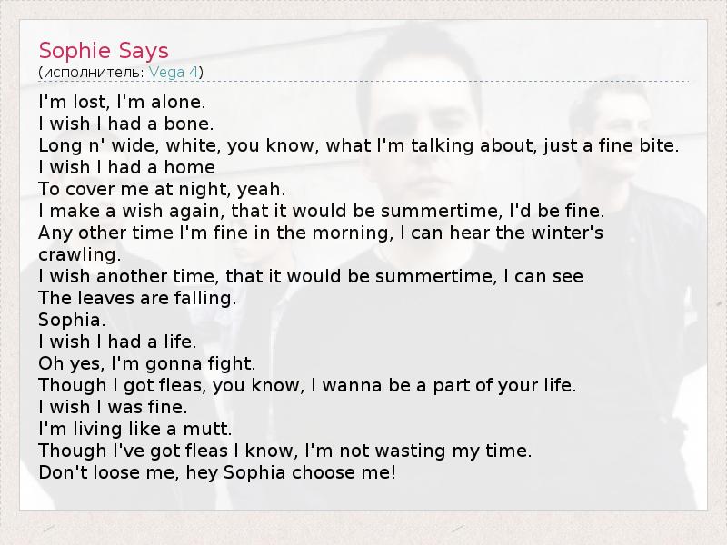 I'm lost, I'm alone. I wish I had a bone. Long n' wide, white, you know, what I'm talking about, just a fine bite. I wish I had a home To cover me at night, yeah. I make a wish again, that it would be summertime, I'd be fine. Any other time I'm fine in the morning, I can hear the winter's crawling. I wish another time, that it would be summertime, I can see The leaves are falling. Sophia. I wish I had a life. Oh yes, I'm gonna fight. Though I got fleas, you know, I wanna be a part of your life. I wish I was fine. I'm living like a mutt. Though I've got fleas I know, I'm not wasting my time. Don't loose me, hey Sophia choose me!