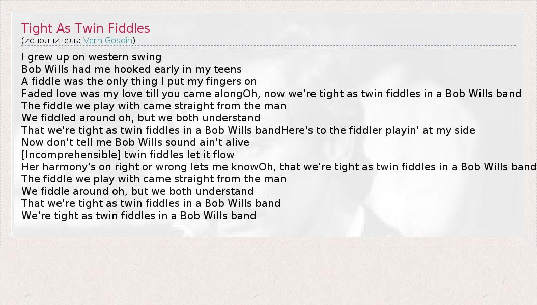 I grew up on western swing Bob Wills had me hooked early in my teens A fiddle was the only thing I put my fingers on Faded love was my love till you came alongOh, now we're tight as twin fiddles in a Bob Wills band The fiddle we play with came straight from the man We fiddled around oh, but we both understand That we're tight as twin fiddles in a Bob Wills bandHere's to the fiddler playin' at my side Now don't tell me Bob Wills sound ain't alive [Incomprehensible] twin fiddles let it flow Her harmony's on right or wrong lets me knowOh, that we're tight as twin fiddles in a Bob Wills band The fiddle we play with came straight from the man We fiddle around oh, but we both understand That we're tight as twin fiddles in a Bob Wills band We're tight as twin fiddles in a Bob Wills band