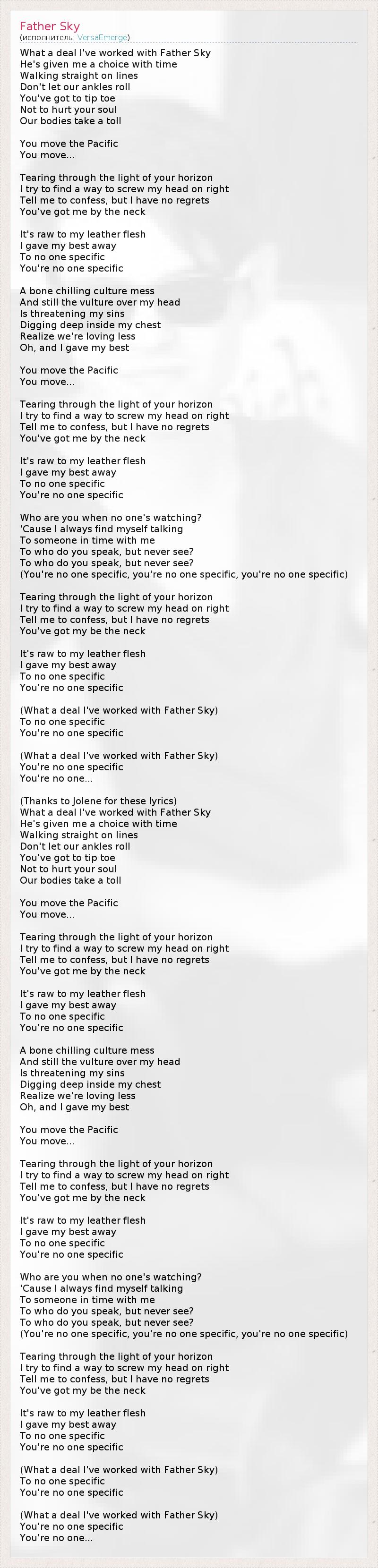 What a deal I've worked with Father Sky He's given me a choice with time Walking straight on lines Don't let our ankles roll You've got to tip toe Not to hurt your soul Our bodies take a toll You move the Pacific You move... Tearing through the light of your horizon I try to find a way to screw my head on right Tell me to confess, but I have no regrets You've got me by the neck It's raw to my leather flesh I gave my best away To no one specific You're no one specific A bone chilling culture mess And still the vulture over my head Is threatening my sins Digging deep inside my chest Realize we're loving less Oh, and I gave my best You move the Pacific You move... Tearing through the light of your horizon I try to find a way to screw my head on right Tell me to confess, but I have no regrets You've got me by the neck It's raw to my leather flesh I gave my best away To no one specific You're no one specific Who are you when no one's watching? 'Cause I always find myself talking To someone in time with me To who do you speak, but never see? To who do you speak, but never see? (You're no one specific, you're no one specific, you're no one specific) Tearing through the light of your horizon I try to find a way to screw my head on right Tell me to confess, but I have no regrets You've got my be the neck It's raw to my leather flesh I gave my best away To no one specific You're no one specific (What a deal I've worked with Father Sky) To no one specific You're no one specific (What a deal I've worked with Father Sky) You're no one specific You're no one... (Thanks to Jolene for these lyrics) What a deal I've worked with Father Sky He's given me a choice with time Walking straight on lines Don't let our ankles roll You've got to tip toe Not to hurt your soul Our bodies take a toll You move the Pacific You move... Tearing through the light of your horizon I try to find a way to screw my head on right Tell me to confess, but I have no regrets You've got me by the neck It's raw to my leather flesh I gave my best away To no one specific You're no one specific A bone chilling culture mess And still the vulture over my head Is threatening my sins Digging deep inside my chest Realize we're loving less Oh, and I gave my best You move the Pacific You move... Tearing through the light of your horizon I try to find a way to screw my head on right Tell me to confess, but I have no regrets You've got me by the neck It's raw to my leather flesh I gave my best away To no one specific You're no one specific Who are you when no one's watching? 'Cause I always find myself talking To someone in time with me To who do you speak, but never see? To who do you speak, but never see? (You're no one specific, you're no one specific, you're no one specific) Tearing through the light of your horizon I try to find a way to screw my head on right Tell me to confess, but I have no regrets You've got my be the neck It's raw to my leather flesh I gave my best away To no one specific You're no one specific (What a deal I've worked with Father Sky) To no one specific You're no one specific (What a deal I've worked with Father Sky) You're no one specific You're no one...