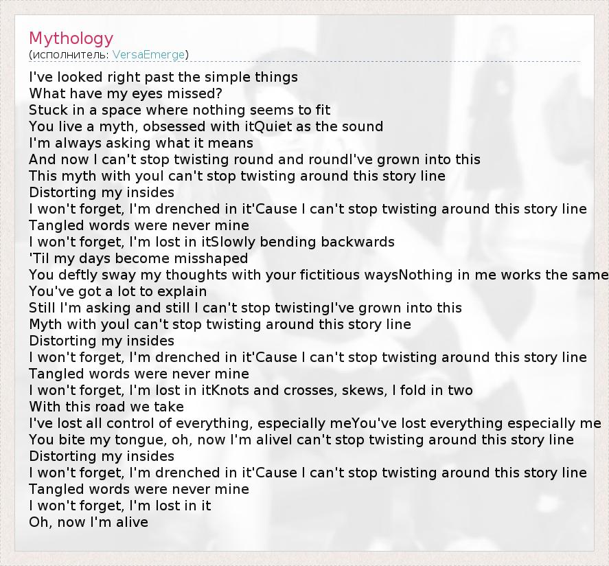 I've looked right past the simple things What have my eyes missed? Stuck in a space where nothing seems to fit You live a myth, obsessed with itQuiet as the sound I'm always asking what it means And now I can't stop twisting round and roundI've grown into this This myth with youI can't stop twisting around this story line Distorting my insides I won't forget, I'm drenched in it'Cause I can't stop twisting around this story line Tangled words were never mine I won't forget, I'm lost in itSlowly bending backwards 'Til my days become misshaped You deftly sway my thoughts with your fictitious waysNothing in me works the same You've got a lot to explain Still I'm asking and still I can't stop twistingI've grown into this Myth with youI can't stop twisting around this story line Distorting my insides I won't forget, I'm drenched in it'Cause I can't stop twisting around this story line Tangled words were never mine I won't forget, I'm lost in itKnots and crosses, skews, I fold in two With this road we take I've lost all control of everything, especially meYou've lost everything especially me You bite my tongue, oh, now I'm aliveI can't stop twisting around this story line Distorting my insides I won't forget, I'm drenched in it'Cause I can't stop twisting around this story line Tangled words were never mine I won't forget, I'm lost in it Oh, now I'm alive