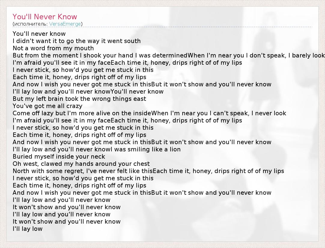 You'll never know I didn't want it to go the way it went south Not a word from my mouth But from the moment I shook your hand I was determinedWhen I'm near you I don't speak, I barely look I'm afraid you'll see it in my faceEach time it, honey, drips right of of my lips I never stick, so how'd you get me stuck in this Each time it, honey, drips right off of my lips And now I wish you never got me stuck in thisBut it won't show and you'll never know I'll lay low and you'll never knowYou'll never know But my left brain took the wrong things east You've got me all crazy Come off lazy but I'm more alive on the insideWhen I'm near you I can't speak, I never look I'm afraid you'll see it in my faceEach time it, honey, drips right of of my lips I never stick, so how'd you get me stuck in this Each time it, honey, drips right off of my lips And now I wish you never got me stuck in thisBut it won't show and you'll never know I'll lay low and you'll never knowI was smiling like a lion Buried myself inside your neck Oh west, clawed my hands around your chest North with some regret, I've never felt like thisEach time it, honey, drips right of of my lips I never stick, so how'd you get me stuck in this Each time it, honey, drips right off of my lips And now I wish you never got me stuck in thisBut it won't show and you'll never know I'll lay low and you'll never know It won't show and you'll never know I'll lay low and you'll never know It won't show and you'll never know I'll lay low