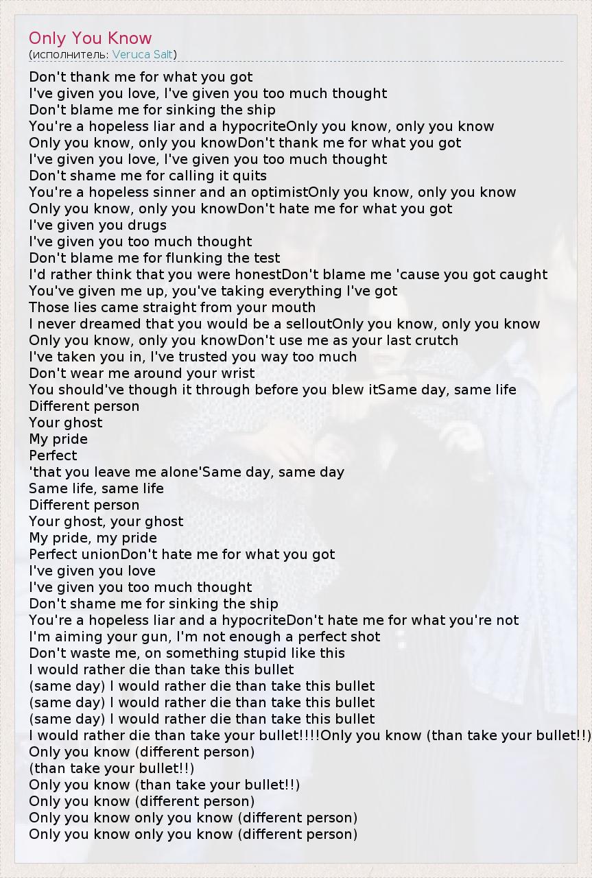 Don't thank me for what you got I've given you love, I've given you too much thought Don't blame me for sinking the ship You're a hopeless liar and a hypocriteOnly you know, only you know Only you know, only you knowDon't thank me for what you got I've given you love, I've given you too much thought Don't shame me for calling it quits You're a hopeless sinner and an optimistOnly you know, only you know Only you know, only you knowDon't hate me for what you got I've given you drugs I've given you too much thought Don't blame me for flunking the test I'd rather think that you were honestDon't blame me 'cause you got caught You've given me up, you've taking everything I've got Those lies came straight from your mouth I never dreamed that you would be a selloutOnly you know, only you know Only you know, only you knowDon't use me as your last crutch I've taken you in, I've trusted you way too much Don't wear me around your wrist You should've though it through before you blew itSame day, same life Different person Your ghost My pride Perfect 'that you leave me alone'Same day, same day Same life, same life Different person Your ghost, your ghost My pride, my pride Perfect unionDon't hate me for what you got I've given you love I've given you too much thought Don't shame me for sinking the ship You're a hopeless liar and a hypocriteDon't hate me for what you're not I'm aiming your gun, I'm not enough a perfect shot Don't waste me, on something stupid like this I would rather die than take this bullet (same day) I would rather die than take this bullet (same day) I would rather die than take this bullet (same day) I would rather die than take this bullet I would rather die than take your bullet!!!!Only you know (than take your bullet!!) Only you know (different person) (than take your bullet!!) Only you know (than take your bullet!!) Only you know (different person) Only you know only you know (different person) Only you know only you know (different person)