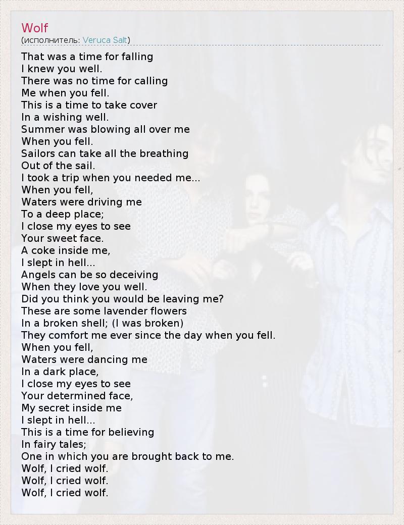 That was a time for falling I knew you well. There was no time for calling Me when you fell. This is a time to take cover In a wishing well. Summer was blowing all over me When you fell. Sailors can take all the breathing Out of the sail. I took a trip when you needed me... When you fell, Waters were driving me To a deep place; I close my eyes to see Your sweet face. A coke inside me, I slept in hell... Angels can be so deceiving When they love you well. Did you think you would be leaving me? These are some lavender flowers In a broken shell; (I was broken) They comfort me ever since the day when you fell. When you fell, Waters were dancing me In a dark place, I close my eyes to see Your determined face, My secret inside me I slept in hell... This is a time for believing In fairy tales; One in which you are brought back to me. Wolf, I cried wolf. Wolf, I cried wolf. Wolf, I cried wolf.