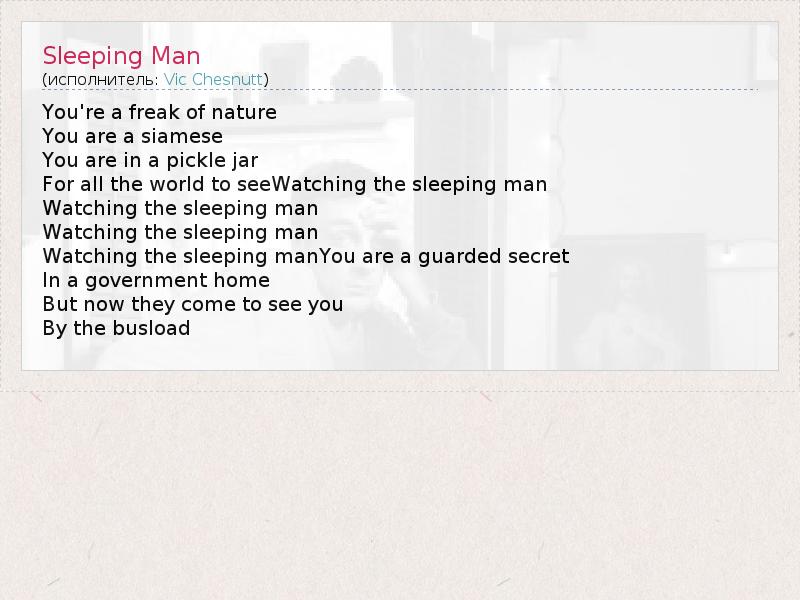 You're a freak of nature You are a siamese You are in a pickle jar For all the world to seeWatching the sleeping man Watching the sleeping man Watching the sleeping man Watching the sleeping manYou are a guarded secret In a government home But now they come to see you By the busload