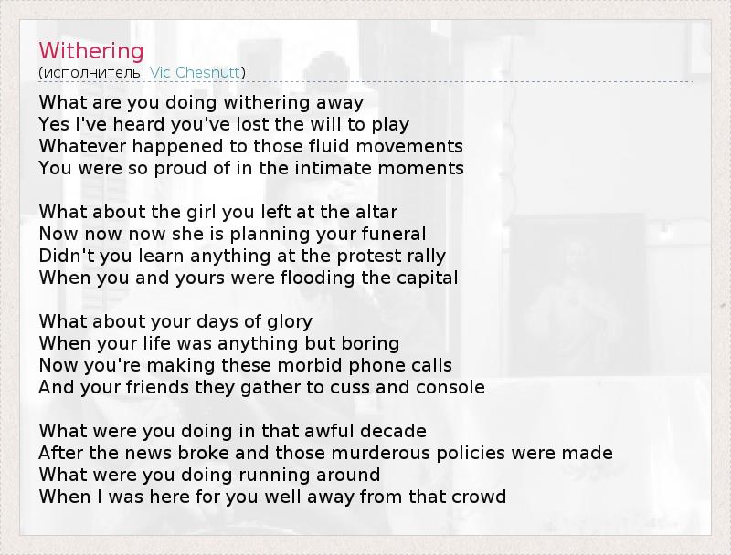 What are you doing withering away Yes I've heard you've lost the will to play Whatever happened to those fluid movements You were so proud of in the intimate moments What about the girl you left at the altar Now now now she is planning your funeral Didn't you learn anything at the protest rally When you and yours were flooding the capital What about your days of glory When your life was anything but boring Now you're making these morbid phone calls And your friends they gather to cuss and console What were you doing in that awful decade After the news broke and those murderous policies were made What were you doing running around When I was here for you well away from that crowd