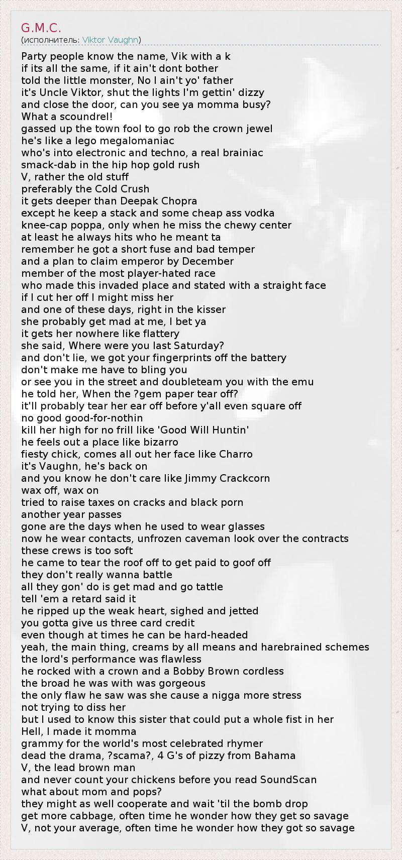 Party people know the name, Vik with a k if its all the same, if it ain't dont bother told the little monster, No I ain't yo' father it's Uncle Viktor, shut the lights I'm gettin' dizzy and close the door, can you see ya momma busy? What a scoundrel! gassed up the town fool to go rob the crown jewel he's like a lego megalomaniac who's into electronic and techno, a real brainiac smack-dab in the hip hop gold rush V, rather the old stuff preferably the Cold Crush it gets deeper than Deepak Chopra except he keep a stack and some cheap ass vodka knee-cap poppa, only when he miss the chewy center at least he always hits who he meant ta remember he got a short fuse and bad temper and a plan to claim emperor by December member of the most player-hated race who made this invaded place and stated with a straight face if I cut her off I might miss her and one of these days, right in the kisser she probably get mad at me, I bet ya it gets her nowhere like flattery she said, Where were you last Saturday? and don't lie, we got your fingerprints off the battery don't make me have to bling you or see you in the street and doubleteam you with the emu he told her, When the ?gem paper tear off? it'll probably tear her ear off before y'all even square off no good good-for-nothin kill her high for no frill like 'Good Will Huntin' he feels out a place like bizarro fiesty chick, comes all out her face like Charro it's Vaughn, he's back on and you know he don't care like Jimmy Crackcorn wax off, wax on tried to raise taxes on cracks and black porn another year passes gone are the days when he used to wear glasses now he wear contacts, unfrozen caveman look over the contracts these crews is too soft he came to tear the roof off to get paid to goof off they don't really wanna battle all they gon' do is get mad and go tattle tell 'em a retard said it he ripped up the weak heart, sighed and jetted you gotta give us three card credit even though at times he can be hard-headed yeah, the main thing, creams by all means and harebrained schemes the lord's performance was flawless he rocked with a crown and a Bobby Brown cordless the broad he was with was gorgeous the only flaw he saw was she cause a nigga more stress not trying to diss her but I used to know this sister that could put a whole fist in her Hell, I made it momma grammy for the world's most celebrated rhymer dead the drama, ?scama?, 4 G's of pizzy from Bahama V, the lead brown man and never count your chickens before you read SoundScan what about mom and pops? they might as well cooperate and wait 'til the bomb drop get more cabbage, often time he wonder how they get so savage V, not your average, often time he wonder how they got so savage