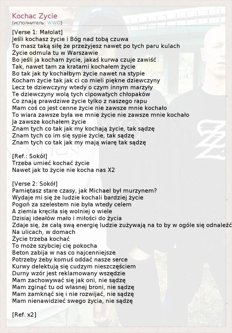 [Verse 1: Małolat] Jeśli kochasz życie i Bóg nad tobą czuwa To masz taką siłę że przeżyjesz nawet po tych paru kulach Życie odmula tu w Warszawie Bo jeśli ja kocham życie, jakaś kurwa czuje zawiść Tak, nawet tam za kratami kochałem życie Bo tak jak ty kochałbym życie nawet na stypie Kocham życie tak jak ci co mieli piękne dziewczyny Lecz te dziewczyny wtedy o czym innym marzyły Te dziewczyny wolą tych cipowatych chłopaków Co znają prawdziwe życie tylko z naszego rapu Mam coś co jest cenne życie nie zawsze mnie kochało To wiara zawsze była we mnie życie nie zawsze mnie kochało Ja zawsze kochałem życie Znam tych co tak jak my kochają życie, tak sądzę Znam tych co im się sypie życie, tak sądzę Znam tych co tak jak my mają wiarę tak sądzę [Ref.: Sokół] Trzeba umieć kochać życie Nawet jak to życie nie kocha nas X2 [Verse 2: Sokół] Pamiętasz stare czasy, jak Michael był murzynem? Wydaje mi się że ludzie kochali bardziej życie Pogoń za szelestem nie była wtedy celem A ziemia kręciła się wolniej o wiele Dzisiaj ideałów mało i miłości do życia Zdaje się, że całą swą energię ludzie zużywają na to by w ogóle się odnaleźć Na ulicach, w domach Życie trzeba kochać To może szybciej cię pokocha Beton zabija w nas co najcenniejsze Potrzeby żeby komuś oddać nasze serce Kurwy delektują się cudzym nieszczęściem Durny wzór jest reklamowany wszędzie Mam zachowywać się jak oni, nie sądzę Mam zginąć tu od własnej broni, nie sądzę Mam zamknąć się i nie rozwijać, nie sądzę Mam nienawidzieć swego życia, nie sądzę [Ref. x2]