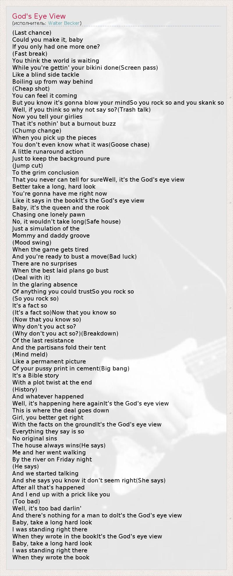 (Last chance) Could you make it, baby If you only had one more one? (Fast break) You think the world is waiting While you're gettin' your bikini done(Screen pass) Like a blind side tackle Boiling up from way behind (Cheap shot) You can feel it coming But you know it's gonna blow your mindSo you rock so and you skank so Well, if you think so why not say so?(Trash talk) Now you tell your girlies That it's nothin' but a burnout buzz (Chump change) When you pick up the pieces You don't even know what it was(Goose chase) A little runaround action Just to keep the background pure (Jump cut) To the grim conclusion That you never can tell for sureWell, it's the God's eye view Better take a long, hard look You're gonna have me right now Like it says in the bookIt's the God's eye view Baby, it's the queen and the rook Chasing one lonely pawn No, it wouldn't take long(Safe house) Just a simulation of the Mommy and daddy groove (Mood swing) When the game gets tired And you're ready to bust a move(Bad luck) There are no surprises When the best laid plans go bust (Deal with it) In the glaring absence Of anything you could trustSo you rock so (So you rock so) It's a fact so (It's a fact so)Now that you know so (Now that you know so) Why don't you act so? (Why don't you act so?)(Breakdown) Of the last resistance And the partisans fold their tent (Mind meld) Like a permanent picture Of your pussy print in cement(Big bang) It's a Bible story With a plot twist at the end (History) And whatever happened Well, it's happening here againIt's the God's eye view This is where the deal goes down Girl, you better get right With the facts on the groundIt's the God's eye view Everything they say is so No original sins The house always wins(He says) Me and her went walking By the river on Friday night (He says) And we started talking And she says you know it don't seem right(She says) After all that's happened And I end up with a prick like you (Too bad) Well, it's too bad darlin' And there's nothing for a man to doIt's the God's eye view Baby, take a long hard look I was standing right there When they wrote in the bookIt's the God's eye view Baby, take a long hard look I was standing right there When they wrote the book