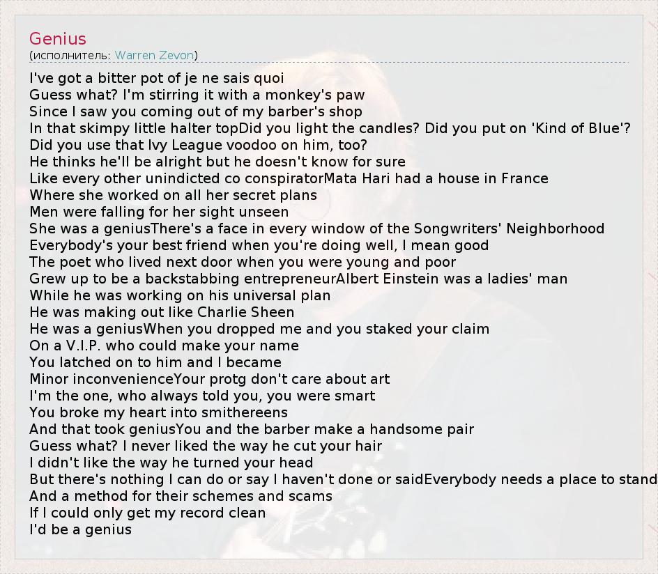 Это интересно:Уоррен Зивон - лаурет премии Грэмми, американский композитор, певец и музыкант. Список музыкантов, игравших в его альбомах, можно перепутать с алфавитным указателем справочника "Кто есть кто в современной рок-музыке": Боб Дилан, Дэвид Гилмор, Брюс Спрингстин, Том Петти сотоварищи, Грэм Нэш и Нил Янг, группа R.E.M. в полном составе… Вдохновение он черпал из совершенно разных источников... продолжение