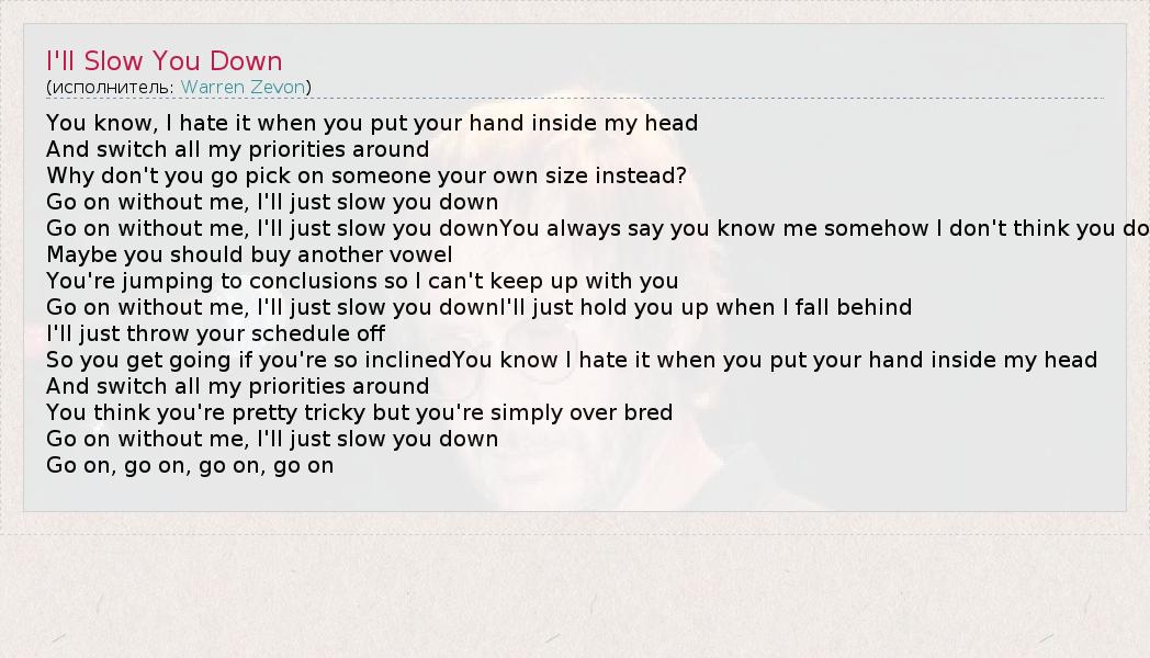 Это интересно:Уоррен Зивон - лаурет премии Грэмми, американский композитор, певец и музыкант. Список музыкантов, игравших в его альбомах, можно перепутать с алфавитным указателем справочника "Кто есть кто в современной рок-музыке": Боб Дилан, Дэвид Гилмор, Брюс Спрингстин, Том Петти сотоварищи, Грэм Нэш и Нил Янг, группа R.E.M. в полном составе… Вдохновение он черпал из совершенно разных источников... продолжение