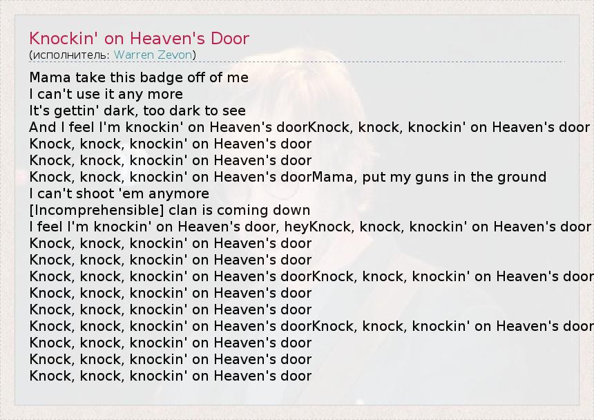 Knock, knock, knockin' on Heaven's doorKnock, knock, knockin' on Heaven's door