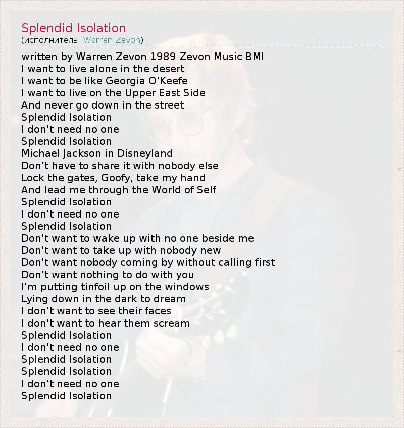 written by Warren Zevon 1989 Zevon Music BMI I want to live alone in the desert I want to be like Georgia O'Keefe I want to live on the Upper East Side And never go down in the street Splendid Isolation I don't need no one Splendid Isolation Michael Jackson in Disneyland Don't have to share it with nobody else Lock the gates, Goofy, take my hand And lead me through the World of Self Splendid Isolation I don't need no one Splendid Isolation Don't want to wake up with no one beside me Don't want to take up with nobody new Don't want nobody coming by without calling first Don't want nothing to do with you I'm putting tinfoil up on the windows Lying down in the dark to dream I don't want to see their faces I don't want to hear them scream Splendid Isolation I don't need no one Splendid Isolation Splendid Isolation I don't need no one Splendid Isolation