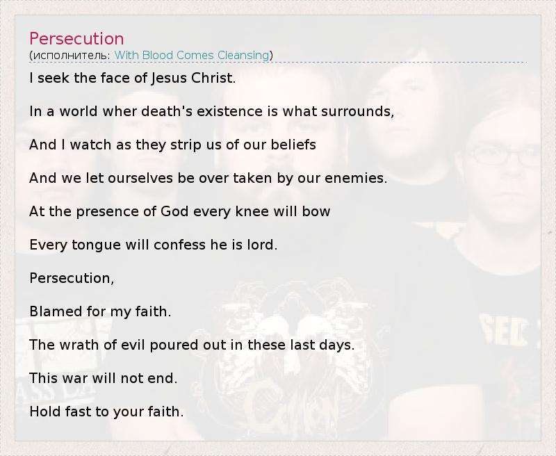 Это интересно:With Blood Comes Cleansing - христианская дэткор-команда из Джорджии. После самостоятельного выпуска в январе 2006 ЕР с шестью песнями, парни почти сразу начали сотрудничество с звукозаписывающей компанией Blood and Ink Records. Далее летом 2007 With Blood Comes Cleansing выпускают свой первый альбом под названием Golgotha. После этого команда отправляется в тур и завоевывает огромное количество фанатов по всей Америке. Вскоре... продолжение