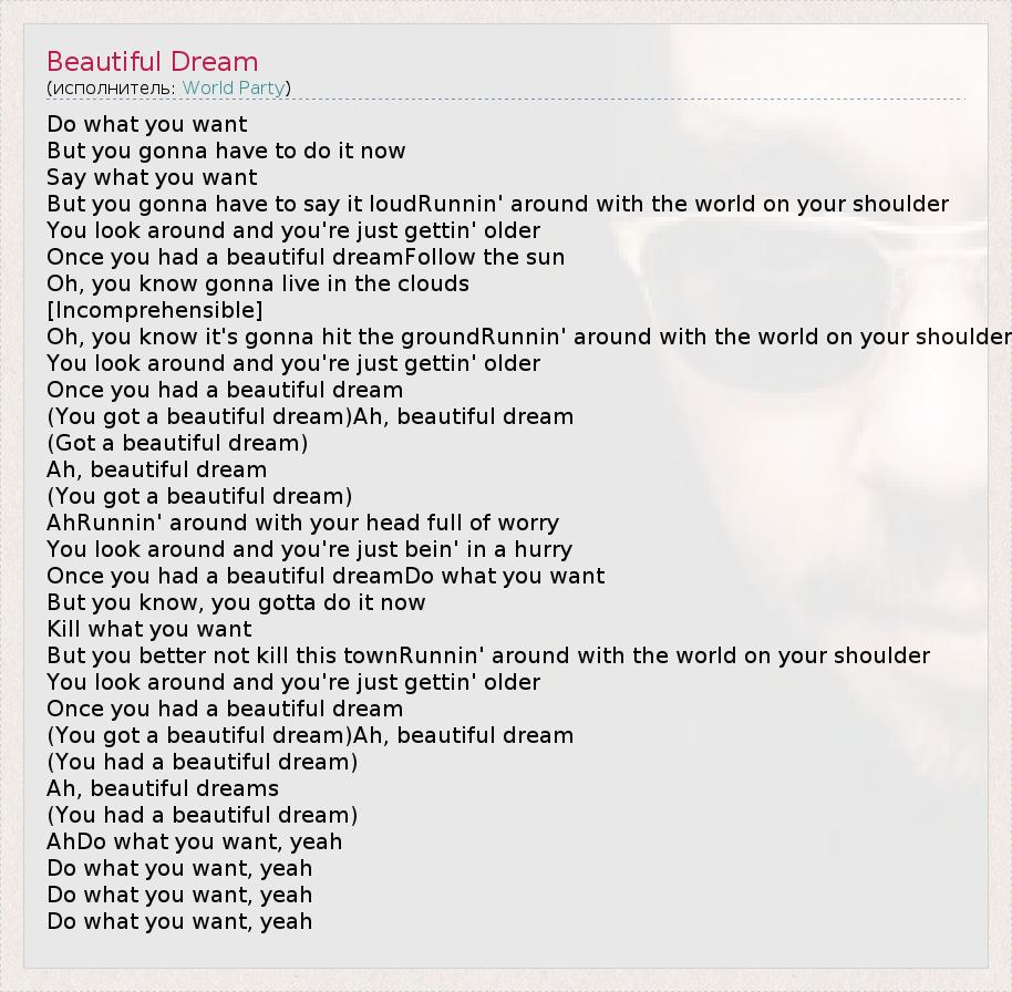 Do what you want But you gonna have to do it now Say what you want But you gonna have to say it loudRunnin' around with the world on your shoulder You look around and you're just gettin' older Once you had a beautiful dreamFollow the sun Oh, you know gonna live in the clouds [Incomprehensible] Oh, you know it's gonna hit the groundRunnin' around with the world on your shoulder You look around and you're just gettin' older Once you had a beautiful dream (You got a beautiful dream)Ah, beautiful dream (Got a beautiful dream) Ah, beautiful dream (You got a beautiful dream) AhRunnin' around with your head full of worry You look around and you're just bein' in a hurry Once you had a beautiful dreamDo what you want But you know, you gotta do it now Kill what you want But you better not kill this townRunnin' around with the world on your shoulder You look around and you're just gettin' older Once you had a beautiful dream (You got a beautiful dream)Ah, beautiful dream (You had a beautiful dream) Ah, beautiful dreams (You had a beautiful dream) AhDo what you want, yeah Do what you want, yeah Do what you want, yeah Do what you want, yeah