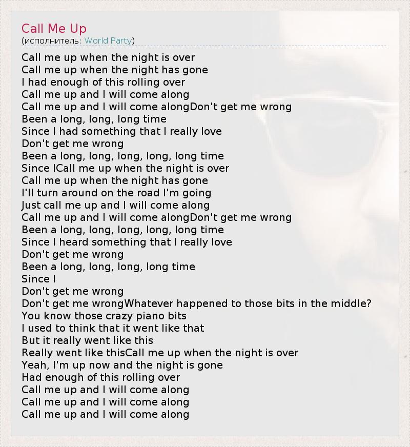 Call me up when the night is over Call me up when the night has gone I had enough of this rolling over Call me up and I will come along Call me up and I will come alongDon't get me wrong Been a long, long, long time Since I had something that I really love Don't get me wrong Been a long, long, long, long, long time Since ICall me up when the night is over Call me up when the night has gone I'll turn around on the road I'm going Just call me up and I will come along Call me up and I will come alongDon't get me wrong Been a long, long, long, long, long time Since I heard something that I really love Don't get me wrong Been a long, long, long, long time Since I Don't get me wrong Don't get me wrongWhatever happened to those bits in the middle? You know those crazy piano bits I used to think that it went like that But it really went like this Really went like thisCall me up when the night is over Yeah, I'm up now and the night is gone Had enough of this rolling over Call me up and I will come along Call me up and I will come along Call me up and I will come along