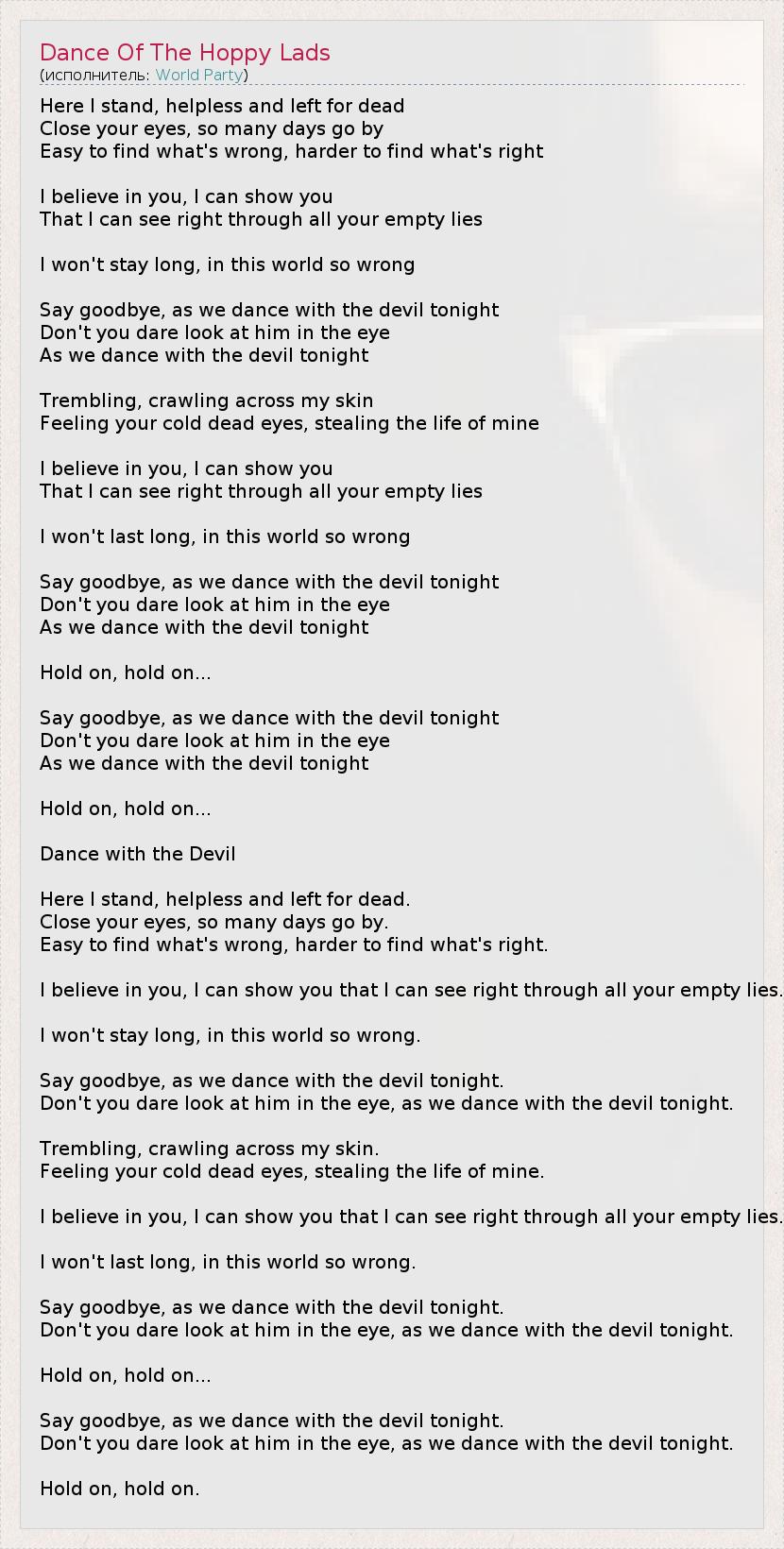 Вот он я, брошенный здесь на смерть. Сомкни глаза, прошло так много дней, Просто найти изъян, правду найти трудней. Верю я в тебя, посмотри в себя — Вижу я насквозь всю пустую ложь. Оставлю я этот мир вранья. Прощай, танец с дьяволом в ночь начинай, Но не смей поднимать к нему глаз, Ночью с дьяволом танец у нас. Мёртвая дрожь словно ползёт по мне, И твой холодный взгляд жизнь крадёт во мне. Верю я в тебя, посмотри в себя - Вижу я насквозь всю пустую ложь. Покину я этот мир вранья. Прощай, танец с дьяволом в ночь начинай, Но не смей поднимать к нему глаз, Ночью с дьяволом танец у нас. Не унывай, не унывай... Прощай, танец с дьяволом в ночь начинай, Но не смей поднимать к нему глаз, Ночью с дьяволом танец у нас. Не унывай, не унывай... Танец с дьяволом (перевод AlonZo AlonZo из Москвы) Я стою здесь, беспомощный и оставленный умирать. Закрой глаза, так много дней прошло. Легко найти, что не так, сложнее найти, что верно. Я верю в тебя, я могу показать, что вижу тебя насквозь, всю твою пустую ложь. Я не протяну долго в мире, где всё неправильно... Попрощайся, ибо этим вечером у нас танец с дьяволом. Не рискуй смотреть ему в глаза, ибо этим вечером у нас танец с дьяволом. Дрожь пробегает по телу, когда чувствую, как твои мертвые холодные глаза, забирают у меня жизнь. Я верю в тебя, я могу показать, что вижу тебя насквозь, всю твою пустую ложь. Я не протяну долго в мире, где всё неправильно... Попрощайся, ибо этим вечером у нас танец с дьяволом. Не рискуй смотреть ему в глаза, ибо этим вечером у нас танец с дьяволом. Держись, держись... Попрощайся, ибо этим вечером у нас танец с дьяволом. Не рискуй смотреть ему в глаза, ибо этим вечером у нас танец с дьяволом. Держись, держись...