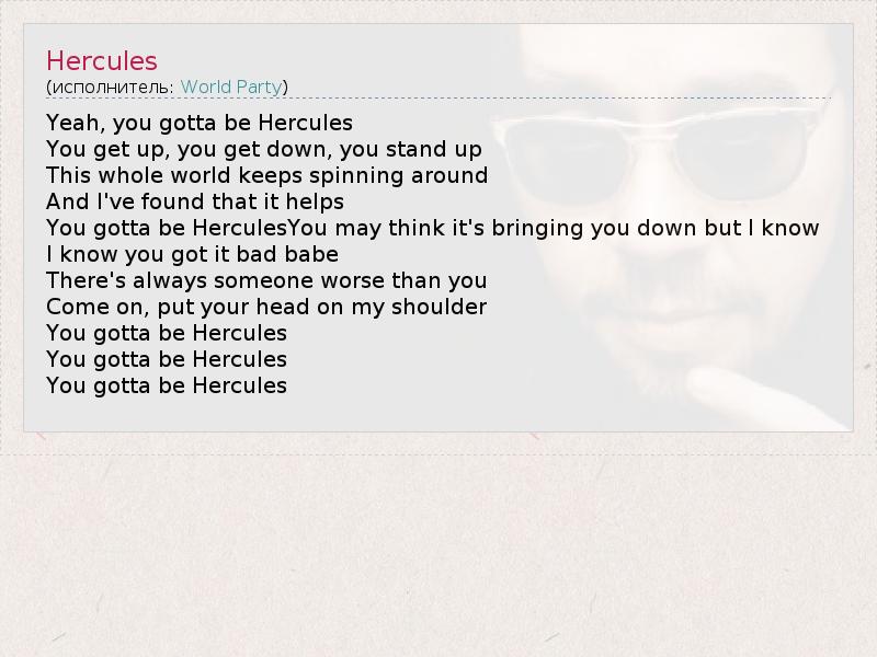 Yeah, you gotta be Hercules You get up, you get down, you stand up This whole world keeps spinning around And I've found that it helps You gotta be HerculesYou may think it's bringing you down but I know I know you got it bad babe There's always someone worse than you Come on, put your head on my shoulder You gotta be Hercules You gotta be Hercules You gotta be Hercules