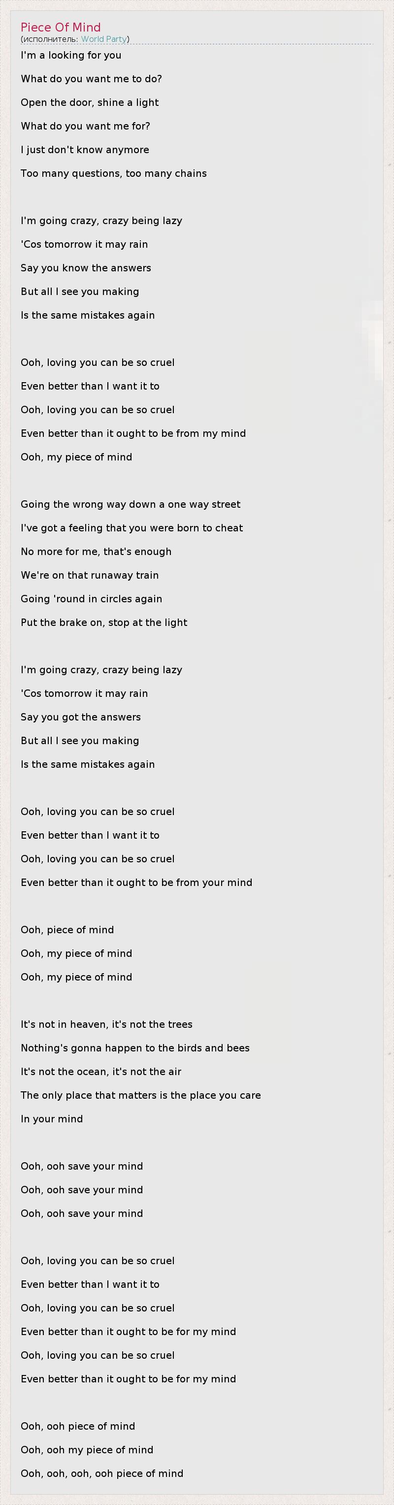 I'm a looking for you What do you want me to do? Open the door, shine a light What do you want me for? I just don't know anymore Too many questions, too many chains I'm going crazy, crazy being lazy 'Cos tomorrow it may rain Say you know the answers But all I see you making Is the same mistakes again Ooh, loving you can be so cruel Even better than I want it to Ooh, loving you can be so cruel Even better than it ought to be from my mind Ooh, my piece of mind Going the wrong way down a one way street I've got a feeling that you were born to cheat No more for me, that's enough We're on that runaway train Going 'round in circles again Put the brake on, stop at the light I'm going crazy, crazy being lazy 'Cos tomorrow it may rain Say you got the answers But all I see you making Is the same mistakes again Ooh, loving you can be so cruel Even better than I want it to Ooh, loving you can be so cruel Even better than it ought to be from your mind Ooh, piece of mind Ooh, my piece of mind Ooh, my piece of mind It's not in heaven, it's not the trees Nothing's gonna happen to the birds and bees It's not the ocean, it's not the air The only place that matters is the place you care In your mind Ooh, ooh save your mind Ooh, ooh save your mind Ooh, ooh save your mind Ooh, loving you can be so cruel Even better than I want it to Ooh, loving you can be so cruel Even better than it ought to be for my mind Ooh, loving you can be so cruel Even better than it ought to be for my mind Ooh, ooh piece of mind Ooh, ooh my piece of mind Ooh, ooh, ooh, ooh piece of mind