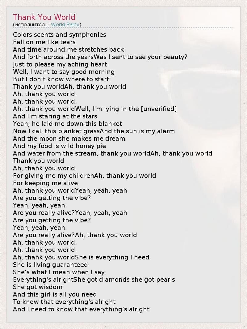 Colors scents and symphonies Fall on me like tears And time around me stretches back And forth across the yearsWas I sent to see your beauty? Just to please my aching heart Well, I want to say good morning But I don't know where to start Thank you worldAh, thank you world Ah, thank you world Ah, thank you world Ah, thank you worldWell, I'm lying in the [unverified] And I'm staring at the stars Yeah, he laid me down this blanket Now I call this blanket grassAnd the sun is my alarm And the moon she makes me dream And my food is wild honey pie And water from the stream, thank you worldAh, thank you world Thank you world Ah, thank you world For giving me my childrenAh, thank you world For keeping me alive Ah, thank you worldYeah, yeah, yeah Are you getting the vibe? Yeah, yeah, yeah Are you really alive?Yeah, yeah, yeah Are you getting the vibe? Yeah, yeah, yeah Are you really alive?Ah, thank you world Ah, thank you world Ah, thank you world Ah, thank you worldShe is everything I need She is living guaranteed She's what I mean when I say Everything's alrightShe got diamonds she got pearls She got wisdom And this girl is all you need To know that everything's alright And I need to know that everything's alright