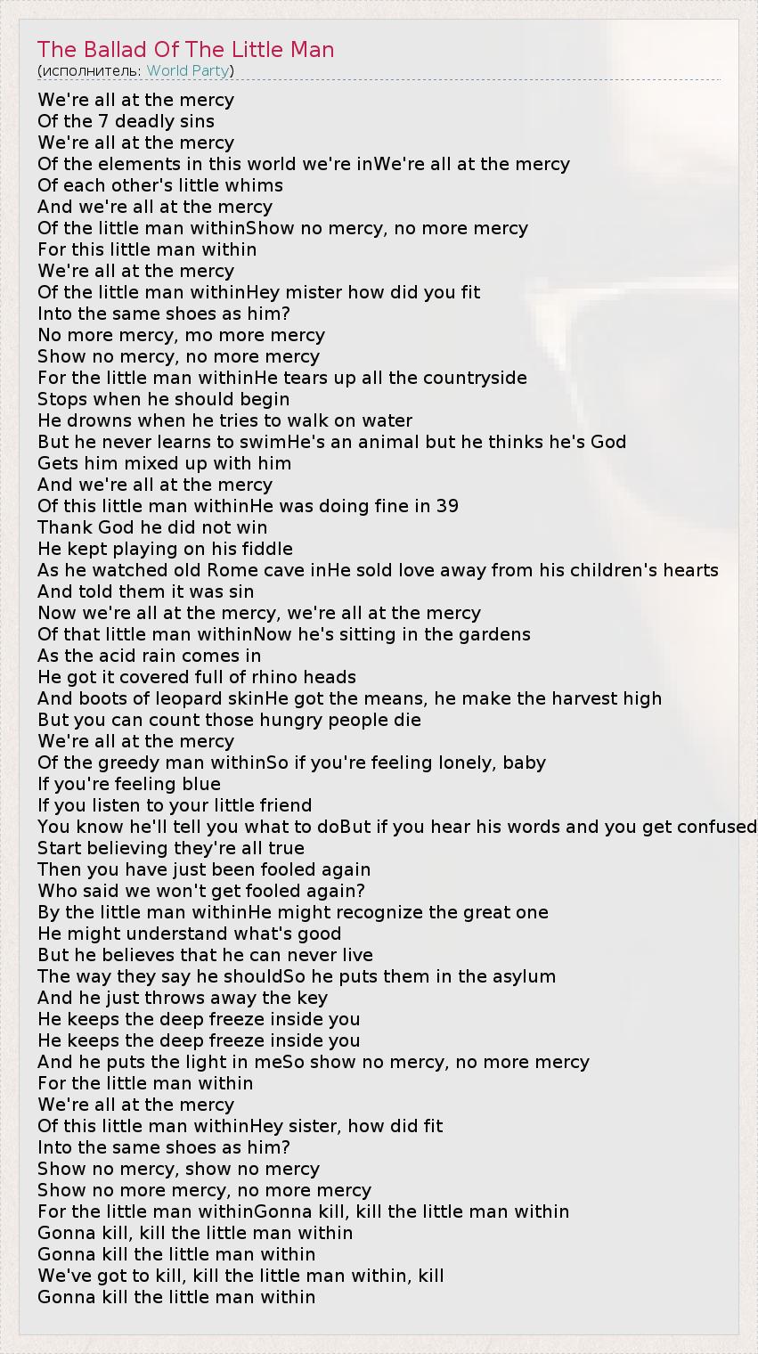 We're all at the mercy Of the 7 deadly sins We're all at the mercy Of the elements in this world we're inWe're all at the mercy Of each other's little whims And we're all at the mercy Of the little man withinShow no mercy, no more mercy For this little man within We're all at the mercy Of the little man withinHey mister how did you fit Into the same shoes as him? No more mercy, mo more mercy Show no mercy, no more mercy For the little man withinHe tears up all the countryside Stops when he should begin He drowns when he tries to walk on water But he never learns to swimHe's an animal but he thinks he's God Gets him mixed up with him And we're all at the mercy Of this little man withinHe was doing fine in 39 Thank God he did not win He kept playing on his fiddle As he watched old Rome cave inHe sold love away from his children's hearts And told them it was sin Now we're all at the mercy, we're all at the mercy Of that little man withinNow he's sitting in the gardens As the acid rain comes in He got it covered full of rhino heads And boots of leopard skinHe got the means, he make the harvest high But you can count those hungry people die We're all at the mercy Of the greedy man withinSo if you're feeling lonely, baby If you're feeling blue If you listen to your little friend You know he'll tell you what to doBut if you hear his words and you get confused Start believing they're all true Then you have just been fooled again Who said we won't get fooled again? By the little man withinHe might recognize the great one He might understand what's good But he believes that he can never live The way they say he shouldSo he puts them in the asylum And he just throws away the key He keeps the deep freeze inside you He keeps the deep freeze inside you And he puts the light in meSo show no mercy, no more mercy For the little man within We're all at the mercy Of this little man withinHey sister, how did fit Into the same shoes as him? Show no mercy, show no mercy Show no more mercy, no more mercy For the little man withinGonna kill, kill the little man within Gonna kill, kill the little man within Gonna kill the little man within We've got to kill, kill the little man within, kill Gonna kill the little man within
