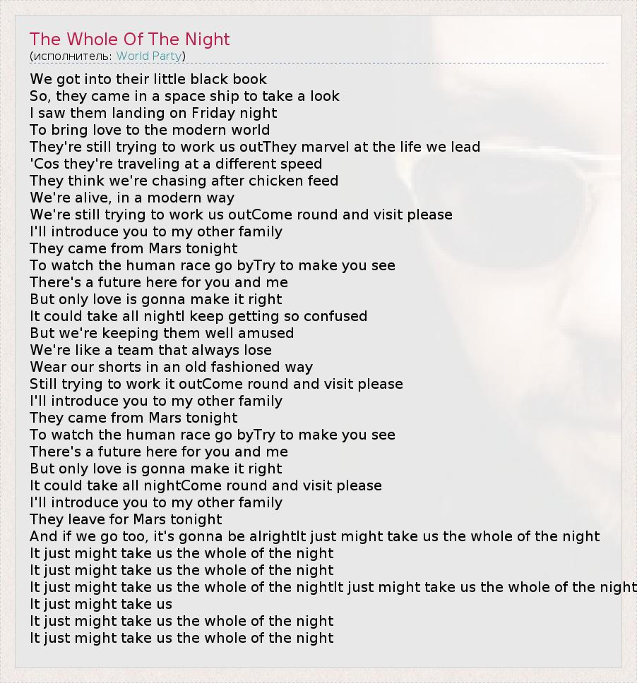 We got into their little black book So, they came in a space ship to take a look I saw them landing on Friday night To bring love to the modern world They're still trying to work us outThey marvel at the life we lead 'Cos they're traveling at a different speed They think we're chasing after chicken feed We're alive, in a modern way We're still trying to work us outCome round and visit please I'll introduce you to my other family They came from Mars tonight To watch the human race go byTry to make you see There's a future here for you and me But only love is gonna make it right It could take all nightI keep getting so confused But we're keeping them well amused We're like a team that always lose Wear our shorts in an old fashioned way Still trying to work it outCome round and visit please I'll introduce you to my other family They came from Mars tonight To watch the human race go byTry to make you see There's a future here for you and me But only love is gonna make it right It could take all nightCome round and visit please I'll introduce you to my other family They leave for Mars tonight And if we go too, it's gonna be alrightIt just might take us the whole of the night It just might take us the whole of the night It just might take us the whole of the night It just might take us the whole of the nightIt just might take us the whole of the night It just might take us It just might take us the whole of the night It just might take us the whole of the night