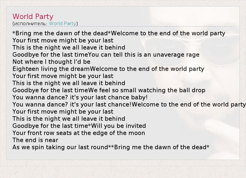 *Bring me the dawn of the dead*Welcome to the end of the world party Your first move might be your last This is the night we all leave it behind Goodbye for the last timeYou can tell this is an unaverage rage Not where I thought I'd be Eighteen living the dreamWelcome to the end of the world party Your first move might be your last This is the night we all leave it behind Goodbye for the last timeWe feel so small watching the ball drop You wanna dance? it's your last chance baby! You wanna dance? it's your last chance!Welcome to the end of the world party Your first move might be your last This is the night we all leave it behind Goodbye for the last time*Will you be invited Your front row seats at the edge of the moon The end is near As we spin taking our last round**Bring me the dawn of the dead*