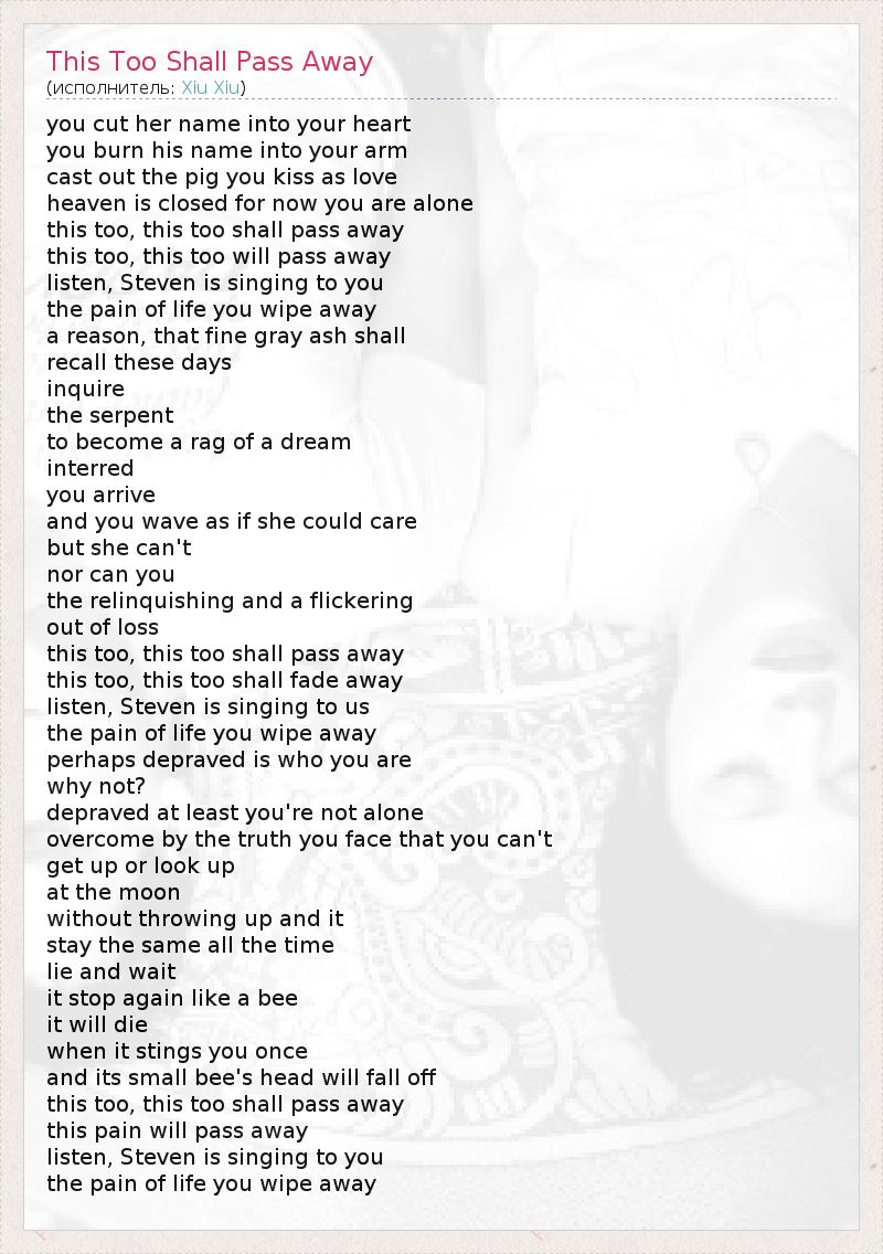 you cut her name into your heart you burn his name into your arm cast out the pig you kiss as love heaven is closed for now you are alone this too, this too shall pass away this too, this too will pass away listen, Steven is singing to you the pain of life you wipe away a reason, that fine gray ash shall recall these days inquire the serpent to become a rag of a dream interred you arrive and you wave as if she could care but she can't nor can you the relinquishing and a flickering out of loss this too, this too shall pass away this too, this too shall fade away listen, Steven is singing to us the pain of life you wipe away perhaps depraved is who you are why not? depraved at least you're not alone overcome by the truth you face that you can't get up or look up at the moon without throwing up and it stay the same all the time lie and wait it stop again like a bee it will die when it stings you once and its small bee's head will fall off this too, this too shall pass away this pain will pass away listen, Steven is singing to you the pain of life you wipe away