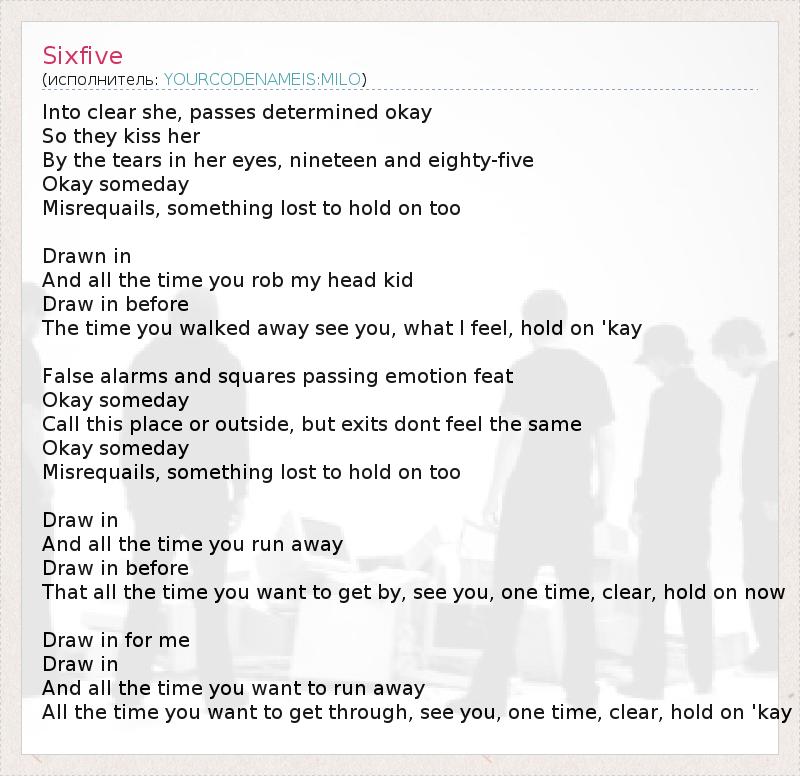 Into clear she, passes determined okay So they kiss her By the tears in her eyes, nineteen and eighty-five Okay someday Misrequails, something lost to hold on too Drawn in And all the time you rob my head kid Draw in before The time you walked away see you, what I feel, hold on 'kay False alarms and squares passing emotion feat Okay someday Call this place or outside, but exits dont feel the same Okay someday Misrequails, something lost to hold on too Draw in And all the time you run away Draw in before That all the time you want to get by, see you, one time, clear, hold on now Draw in for me Draw in And all the time you want to run away All the time you want to get through, see you, one time, clear, hold on 'kay