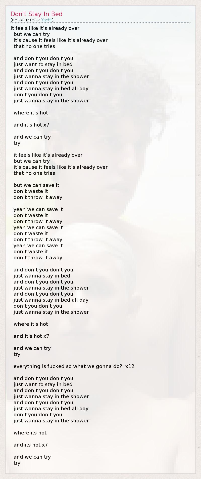 It feels like it's already over but we can try it's cause it feels like it's already over that no one tries and don't you don't you just want to stay in bed and don't you don't you just wanna stay in the shower and don't you don't you just wanna stay in bed all day don't you don't you just wanna stay in the shower where it's hot and it's hot x7 and we can try try it feels like it's already over but we can try it's cause it feels like it's already over that no one tries but we can save it don't waste it don't throw it away yeah we can save it don't waste it don't throw it away yeah we can save it don't waste it don't throw it away yeah we can save it don't waste it don't throw it away and don't you don't you just wanna stay in bed and don't you don't you just wanna stay in the shower and don't you don't you just wanna stay in bed all day don't you don't you just wanna stay in the shower where it's hot and it's hot x7 and we can try try everything is fucked so what we gonna do? x12 and don't you don't you just want to stay in bed and don't you don't you just wanna stay in the shower and don't you don't you just wanna stay in bed all day don't you don't you just wanna stay in the shower where its hot and its hot x7 and we can try try