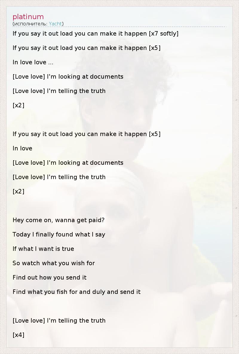 If you say it out load you can make it happen [x7 softly] If you say it out load you can make it happen [x5] In love love ... [Love love] I'm looking at documents [Love love] I'm telling the truth [x2] If you say it out load you can make it happen [x5] In love [Love love] I'm looking at documents [Love love] I'm telling the truth [x2] Hey come on, wanna get paid? Today I finally found what I say If what I want is true So watch what you wish for Find out how you send it Find what you fish for and duly and send it [Love love] I'm telling the truth [x4]