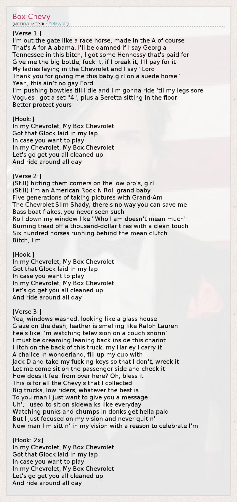 * Box Chevy - сленговое название марки автомобиля Шевроле Кэприс. На русском языке для Шевроле используется разговорное слово Шевик. Данная песня является пятой из серии одноименных песен про Шевроле.