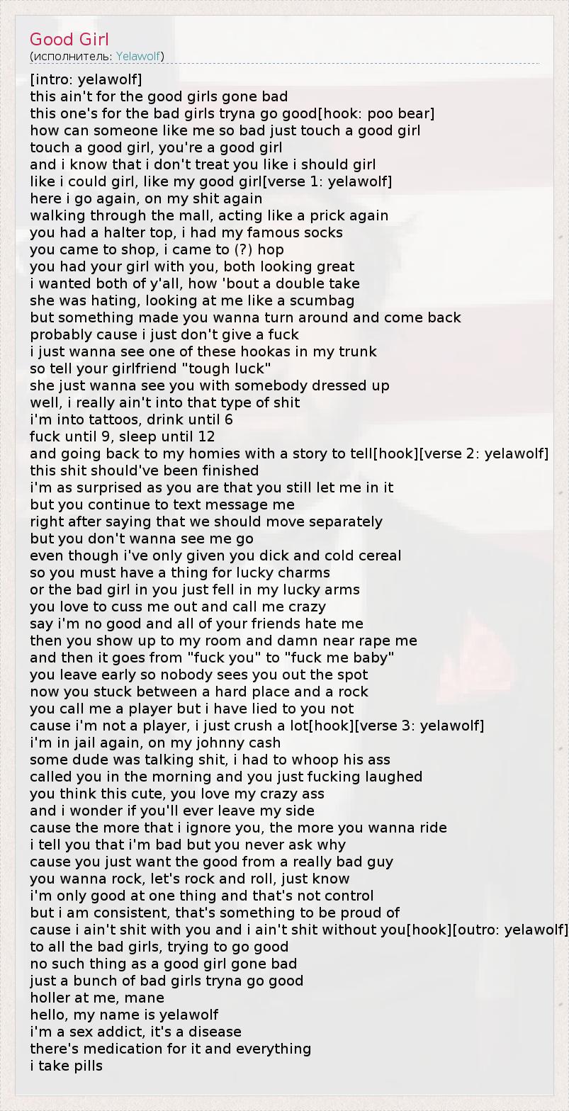 [intro: yelawolf] this ain't for the good girls gone bad this one's for the bad girls tryna go good[hook: poo bear] how can someone like me so bad just touch a good girl touch a good girl, you're a good girl and i know that i don't treat you like i should girl like i could girl, like my good girl[verse 1: yelawolf] here i go again, on my shit again walking through the mall, acting like a prick again you had a halter top, i had my famous socks you came to shop, i came to (?) hop you had your girl with you, both looking great i wanted both of y'all, how 'bout a double take she was hating, looking at me like a scumbag but something made you wanna turn around and come back probably cause i just don't give a fuck i just wanna see one of these hookas in my trunk so tell your girlfriend "tough luck" she just wanna see you with somebody dressed up well, i really ain't into that type of shit i'm into tattoos, drink until 6 fuck until 9, sleep until 12 and going back to my homies with a story to tell[hook][verse 2: yelawolf] this shit should've been finished i'm as surprised as you are that you still let me in it but you continue to text message me right after saying that we should move separately but you don't wanna see me go even though i've only given you dick and cold cereal so you must have a thing for lucky charms or the bad girl in you just fell in my lucky arms you love to cuss me out and call me crazy say i'm no good and all of your friends hate me then you show up to my room and damn near rape me and then it goes from "fuck you" to "fuck me baby" you leave early so nobody sees you out the spot now you stuck between a hard place and a rock you call me a player but i have lied to you not cause i'm not a player, i just crush a lot[hook][verse 3: yelawolf] i'm in jail again, on my johnny cash some dude was talking shit, i had to whoop his ass called you in the morning and you just fucking laughed you think this cute, you love my crazy ass and i wonder if you'll ever leave my side cause the more that i ignore you, the more you wanna ride i tell you that i'm bad but you never ask why cause you just want the good from a really bad guy you wanna rock, let's rock and roll, just know i'm only good at one thing and that's not control but i am consistent, that's something to be proud of cause i ain't shit with you and i ain't shit without you[hook][outro: yelawolf] to all the bad girls, trying to go good no such thing as a good girl gone bad just a bunch of bad girls tryna go good holler at me, mane hello, my name is yelawolf i'm a sex addict, it's a disease there's medication for it and everything i take pills