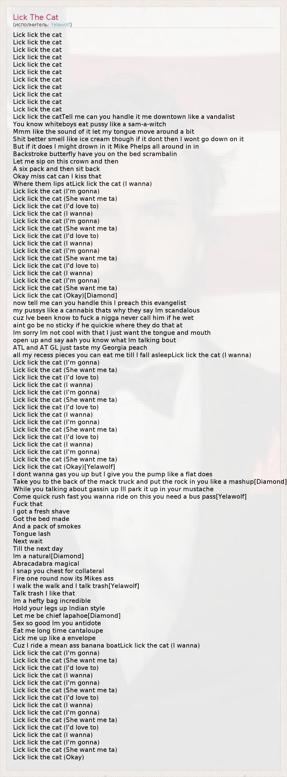 Lick lick the cat Lick lick the cat Lick lick the cat Lick lick the cat Lick lick the cat Lick lick the cat Lick lick the cat Lick lick the cat Lick lick the cat Lick lick the cat Lick lick the cat Lick lick the catTell me can you handle it me downtown like a vandalist You know whiteboys eat pussy like a sam-a-witch Mmm like the sound of it let my tongue move around a bit Shit better smell like ice cream though if it dont then I wont go down on it But if it does I might drown in it Mike Phelps all around in in Backstroke butterfly have you on the bed scrambalin Let me sip on this crown and then A six pack and then sit back Okay miss cat can I kiss that Where them lips atLick lick the cat (I wanna) Lick lick the cat (I'm gonna) Lick lick the cat (She want me ta) Lick lick the cat (I'd love to) Lick lick the cat (I wanna) Lick lick the cat (I'm gonna) Lick lick the cat (She want me ta) Lick lick the cat (I'd love to) Lick lick the cat (I wanna) Lick lick the cat (I'm gonna) Lick lick the cat (She want me ta) Lick lick the cat (I'd love to) Lick lick the cat (I wanna) Lick lick the cat (I'm gonna) Lick lick the cat (She want me ta) Lick lick the cat (Okay)[Diamond] now tell me can you handle this I preach this evangelist my pussys like a cannabis thats why they say Im scandalous cuz Ive been know to fuck a nigga never call him if he wet aint go be no sticky if he quickie where they do that at Im sorry Im not cool with that I just want the tongue and mouth open up and say aah you know what Im talking bout ATL and AT GL just taste my Georgia peach all my recess pieces you can eat me till I fall asleepLick lick the cat (I wanna) Lick lick the cat (I'm gonna) Lick lick the cat (She want me ta) Lick lick the cat (I'd love to) Lick lick the cat (I wanna) Lick lick the cat (I'm gonna) Lick lick the cat (She want me ta) Lick lick the cat (I'd love to) Lick lick the cat (I wanna) Lick lick the cat (I'm gonna) Lick lick the cat (She want me ta) Lick lick the cat (I'd love to) Lick lick the cat (I wanna) Lick lick the cat (I'm gonna) Lick lick the cat (She want me ta) Lick lick the cat (Okay)[Yelawolf] I dont wanna gas you up but I give you the pump like a flat does Take you to the back of the mack truck and put the rock in you like a mashup[Diamond] While you talking about gassin up Ill park it up in your mustache Come quick rush fast you wanna ride on this you need a bus pass[Yelawolf] Fuck that I got a fresh shave Got the bed made And a pack of smokes Tongue lash Next wait Till the next day Im a natural[Diamond] Abracadabra magical I snap you chest for collateral Fire one round now its Mikes ass I walk the walk and I talk trash[Yelawolf] Talk trash I like that Im a hefty bag incredible Hold your legs up Indian style Let me be chief lapahoe[Diamond] Sex so good Im you antidote Eat me long time cantaloupe Lick me up like a envelope Cuz I ride a mean ass banana boatLick lick the cat (I wanna) Lick lick the cat (I'm gonna) Lick lick the cat (She want me ta) Lick lick the cat (I'd love to) Lick lick the cat (I wanna) Lick lick the cat (I'm gonna) Lick lick the cat (She want me ta) Lick lick the cat (I'd love to) Lick lick the cat (I wanna) Lick lick the cat (I'm gonna) Lick lick the cat (She want me ta) Lick lick the cat (I'd love to) Lick lick the cat (I wanna) Lick lick the cat (I'm gonna) Lick lick the cat (She want me ta) Lick lick the cat (Okay)