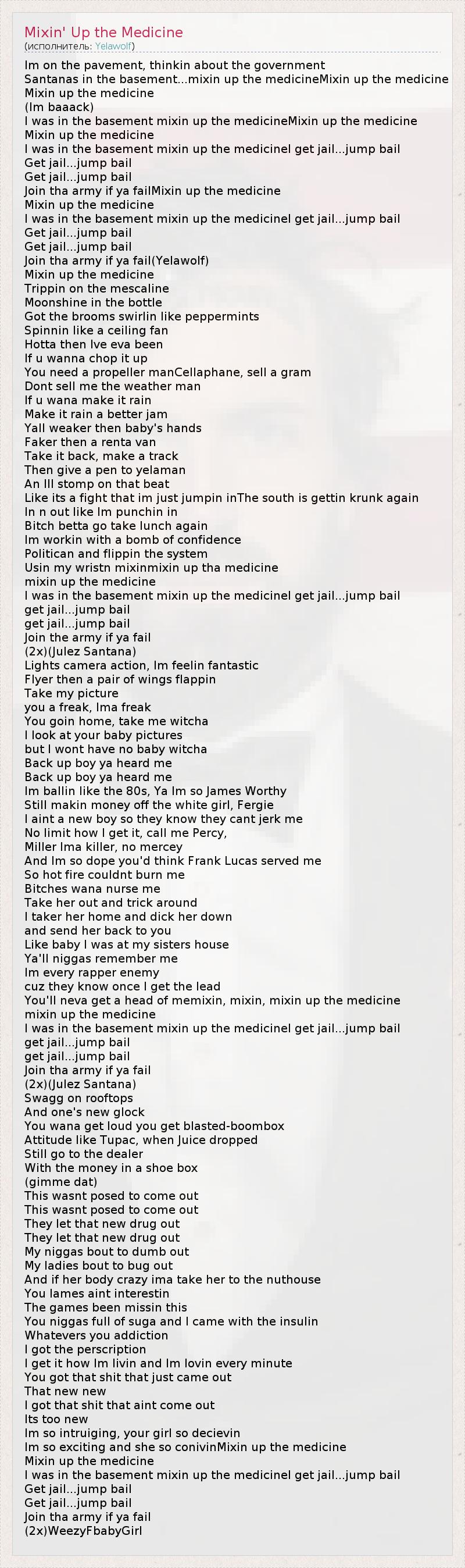 I was in the basement mixin up the medicineI get jail...jump bail