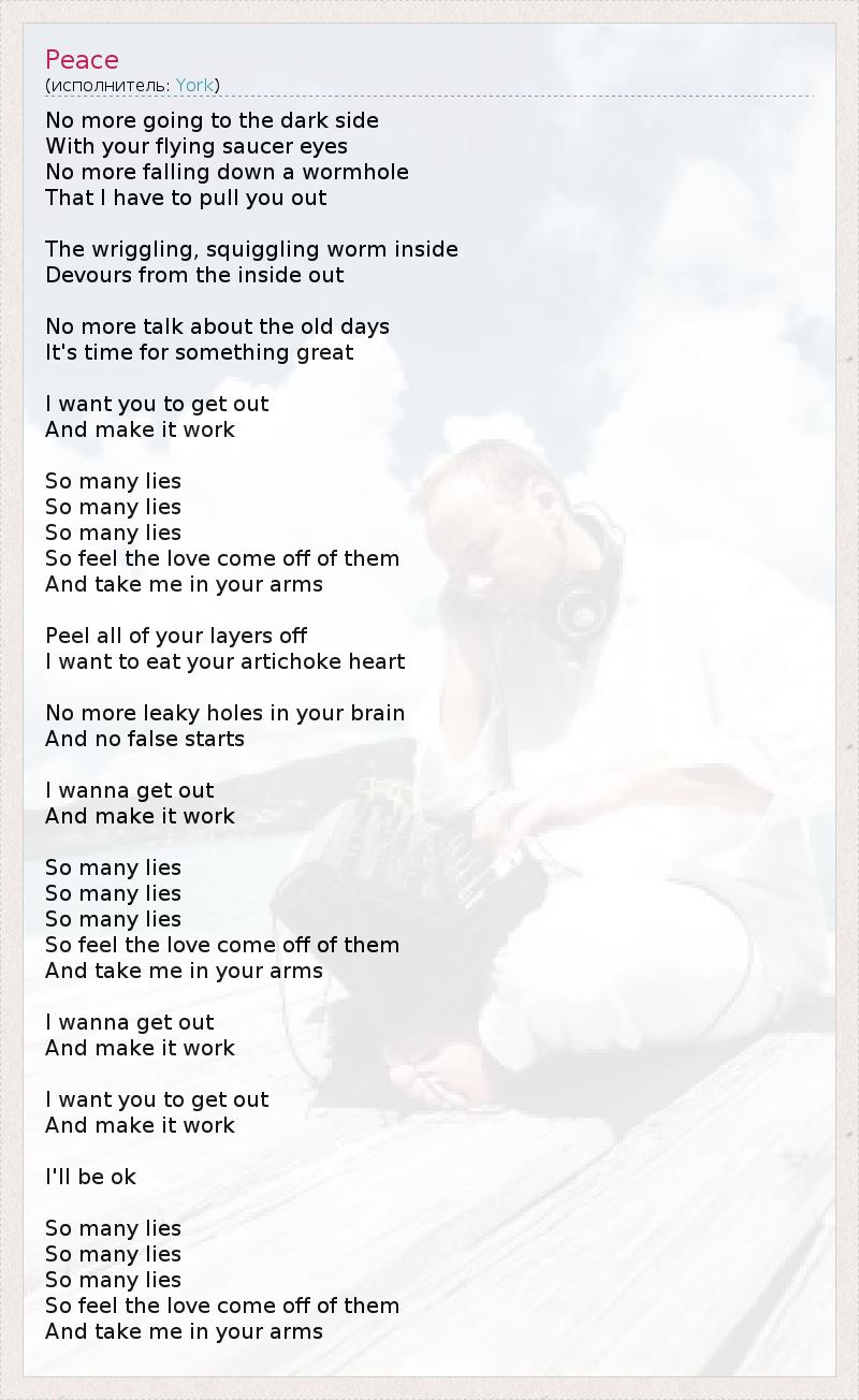 Больше не надо переходить на темную сторону С твоими глазами-летающими-тарелками Больше не надо падать в червиную нору, Из которой мне приходится вытаскивать тебя. Извивающийся, загогулистый червь, что сидит внутри, Пожирает все изнутри. Больше не надо говорить о старых деньках, Пришло время сделать нечто великое. Я хочу, чтобы ты ушел И заставил все это работать. Так много лжи. Так много лжи. Так много лжи. Поэтому почувствуй исходящую от них любовь И заключи меня в свои объятия. Сними все свои слои, Я хочу съесть твое сердце-артишок. Нет больше протекающих отверстий у тебя в мозгу, И нет никаких фальстартов. Я хочу уйти И заставить все это работать. Так много лжи. Так много лжи. Так много лжи. Поэтому почувствуй исходящую от них любовь И заключи меня в свои объятия. Я хочу уйти И заставить все это работать. Я хочу уйти И заставить все это работать. Со мной все будет в порядке. Так много лжи. Так много лжи. Так много лжи. Поэтому почувствуй исходящую от них любовь И заключи меня в свои объятия.