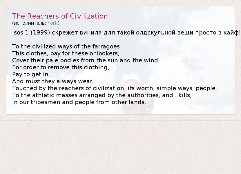 А как ты думаешь, о чем песня "The Reachers of Civilization" ?
