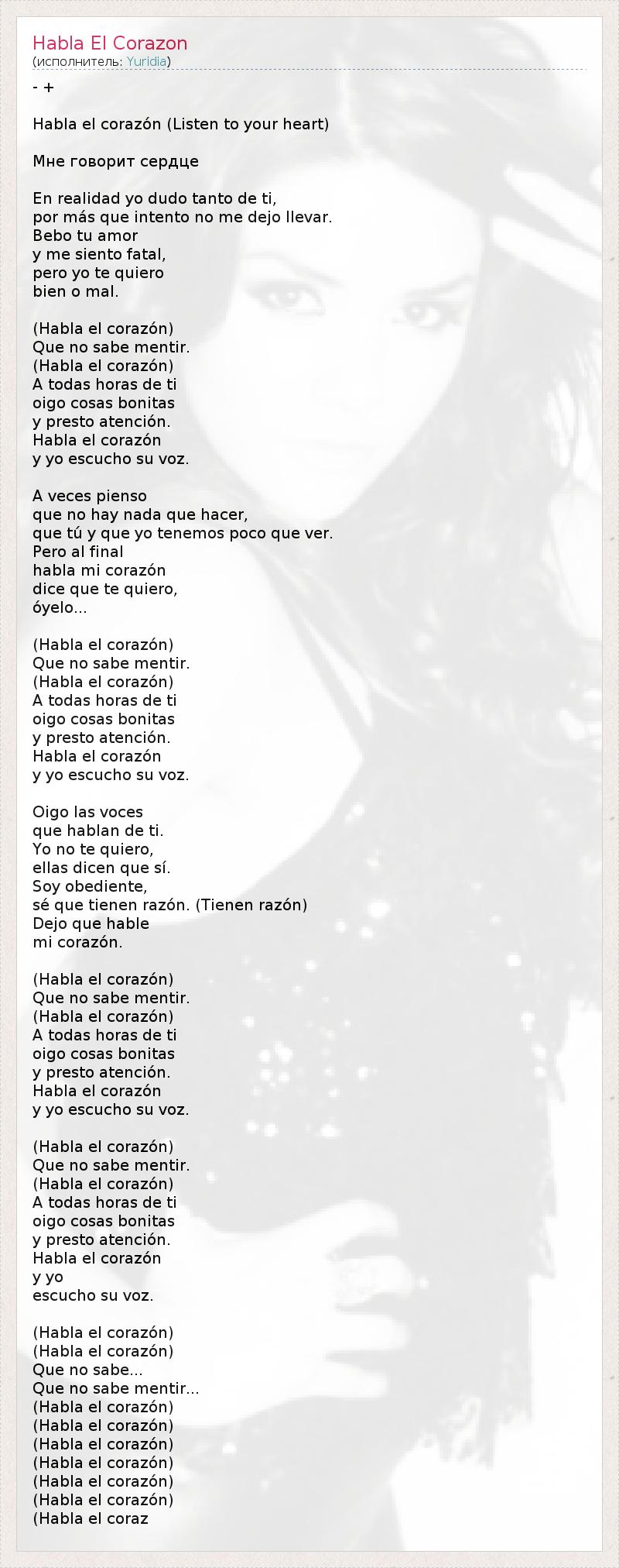 - + Habla el corazón (Listen to your heart) Мне говорит сердце En realidad yo dudo tanto de ti, por más que intento no me dejo llevar. Bebo tu amor y me siento fatal, pero yo te quiero bien o mal. (Habla el corazón) Que no sabe mentir. (Habla el corazón) A todas horas de ti oigo cosas bonitas y presto atención. Habla el corazón y yo escucho su voz. A veces pienso que no hay nada que hacer, que tú y que yo tenemos poco que ver. Pero al final habla mi corazón dice que te quiero, óyelo... (Habla el corazón) Que no sabe mentir. (Habla el corazón) A todas horas de ti oigo cosas bonitas y presto atención. Habla el corazón y yo escucho su voz. Oigo las voces que hablan de ti. Yo no te quiero, ellas dicen que sí. Soy obediente, sé que tienen razón. (Tienen razón) Dejo que hable mi corazón. (Habla el corazón) Que no sabe mentir. (Habla el corazón) A todas horas de ti oigo cosas bonitas y presto atención. Habla el corazón y yo escucho su voz. (Habla el corazón) Que no sabe mentir. (Habla el corazón) A todas horas de ti oigo cosas bonitas y presto atención. Habla el corazón y yo escucho su voz. (Habla el corazón) (Habla el corazón) Que no sabe... Que no sabe mentir... (Habla el corazón) (Habla el corazón) (Habla el corazón) (Habla el corazón) (Habla el corazón) (Habla el corazón) (Habla el coraz