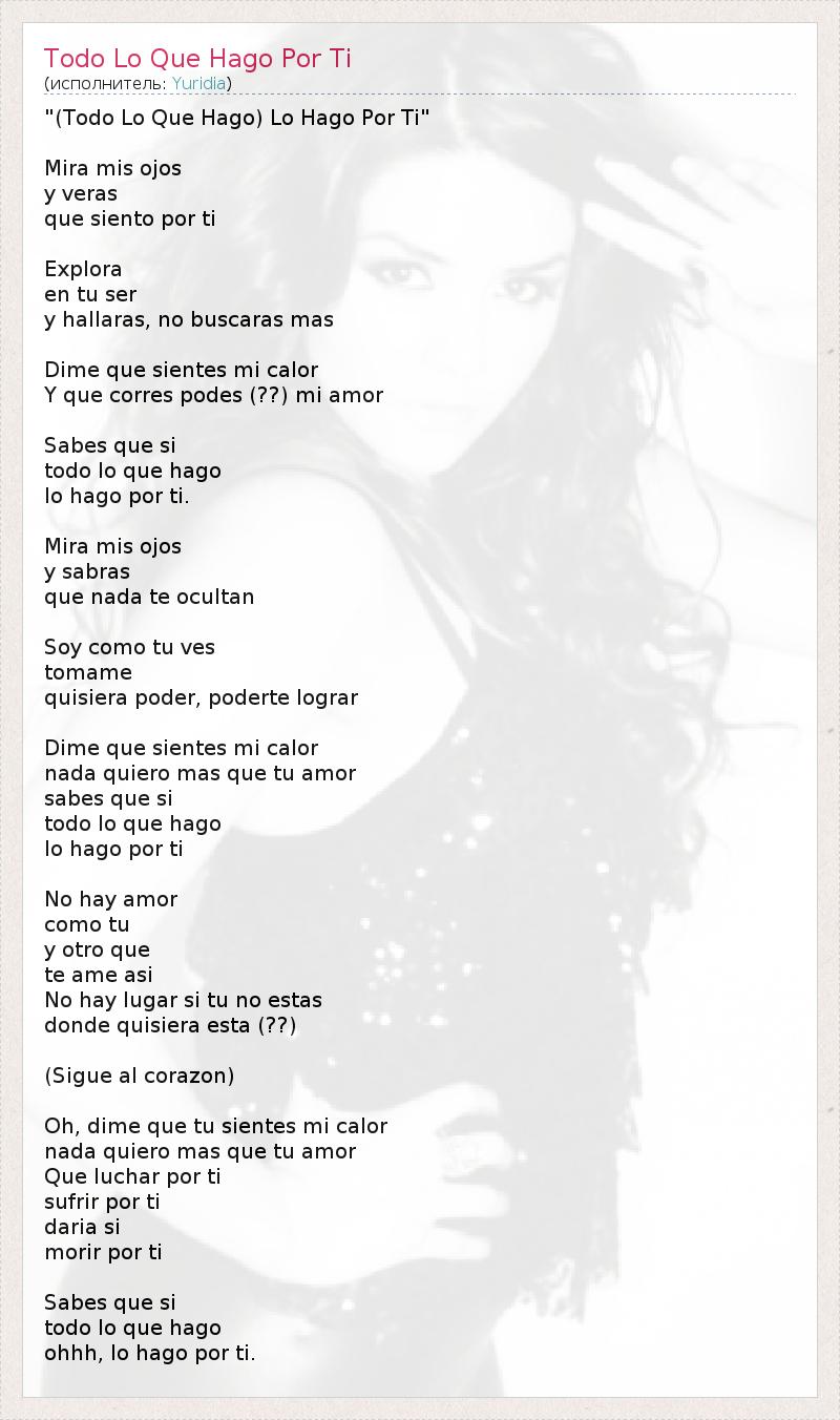 "(Todo Lo Que Hago) Lo Hago Por Ti" Mira mis ojos y veras que siento por ti Explora en tu ser y hallaras, no buscaras mas Dime que sientes mi calor Y que corres podes (??) mi amor Sabes que si todo lo que hago lo hago por ti. Mira mis ojos y sabras que nada te ocultan Soy como tu ves tomame quisiera poder, poderte lograr Dime que sientes mi calor nada quiero mas que tu amor sabes que si todo lo que hago lo hago por ti No hay amor como tu y otro que te ame asi No hay lugar si tu no estas donde quisiera esta (??) (Sigue al corazon) Oh, dime que tu sientes mi calor nada quiero mas que tu amor Que luchar por ti sufrir por ti daria si morir por ti Sabes que si todo lo que hago ohhh, lo hago por ti.