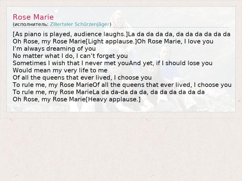 [As piano is played, audience laughs.]La da da da da, da da da da da da Oh Rose, my Rose Marie[Light applause.]Oh Rose Marie, I love you I'm always dreaming of you No matter what I do, I can't forget you Sometimes I wish that I never met youAnd yet, if I should lose you Would mean my very life to me Of all the queens that ever lived, I choose you To rule me, my Rose MarieOf all the queens that ever lived, I choose you To rule me, my Rose MarieLa da da-da da da, da da da da da da Oh Rose, my Rose Marie[Heavy applause.]