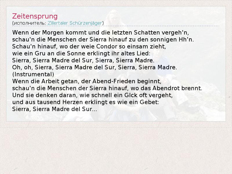 Wenn der Morgen kommt und die letzten Schatten vergeh'n, schau'n die Menschen der Sierra hinauf zu den sonnigen Hh'n. Schau'n hinauf, wo der weie Condor so einsam zieht, wie ein Gru an die Sonne erklingt ihr altes Lied: Sierra, Sierra Madre del Sur, Sierra, Sierra Madre. Oh, oh, Sierra, Sierra Madre del Sur, Sierra, Sierra Madre. (Instrumental) Wenn die Arbeit getan, der Abend-Frieden beginnt, schau'n die Menschen der Sierra hinauf, wo das Abendrot brennt. Und sie denken daran, wie schnell ein Glck oft vergeht, und aus tausend Herzen erklingt es wie ein Gebet: Sierra, Sierra Madre del Sur...