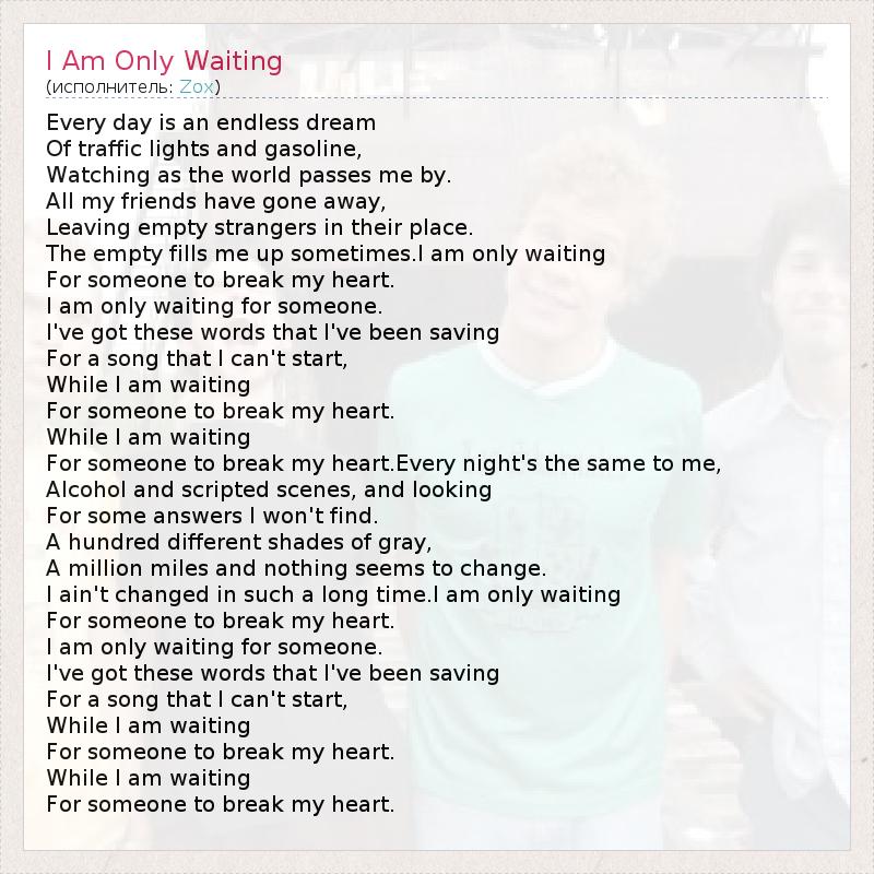 Every day is an endless dream Of traffic lights and gasoline, Watching as the world passes me by. All my friends have gone away, Leaving empty strangers in their place. The empty fills me up sometimes.I am only waiting For someone to break my heart. I am only waiting for someone. I've got these words that I've been saving For a song that I can't start, While I am waiting For someone to break my heart. While I am waiting For someone to break my heart.Every night's the same to me, Alcohol and scripted scenes, and looking For some answers I won't find. A hundred different shades of gray, A million miles and nothing seems to change. I ain't changed in such a long time.I am only waiting For someone to break my heart. I am only waiting for someone. I've got these words that I've been saving For a song that I can't start, While I am waiting For someone to break my heart. While I am waiting For someone to break my heart.