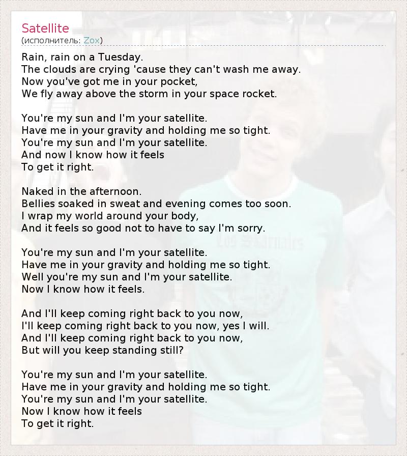 Rain, rain on a Tuesday. The clouds are crying 'cause they can't wash me away. Now you've got me in your pocket, We fly away above the storm in your space rocket. You're my sun and I'm your satellite. Have me in your gravity and holding me so tight. You're my sun and I'm your satellite. And now I know how it feels To get it right. Naked in the afternoon. Bellies soaked in sweat and evening comes too soon. I wrap my world around your body, And it feels so good not to have to say I'm sorry. You're my sun and I'm your satellite. Have me in your gravity and holding me so tight. Well you're my sun and I'm your satellite. Now I know how it feels. And I'll keep coming right back to you now, I'll keep coming right back to you now, yes I will. And I'll keep coming right back to you now, But will you keep standing still? You're my sun and I'm your satellite. Have me in your gravity and holding me so tight. You're my sun and I'm your satellite. Now I know how it feels To get it right.