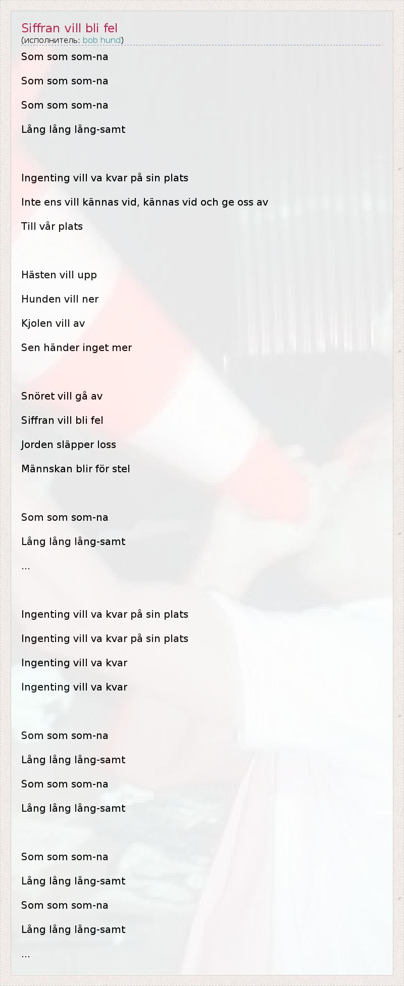 Som som som-na Som som som-na Som som som-na Lång lång lång-samt Ingenting vill va kvar på sin plats Inte ens vill kännas vid, kännas vid och ge oss av Till vår plats Hästen vill upp Hunden vill ner Kjolen vill av Sen händer inget mer Snöret vill gå av Siffran vill bli fel Jorden släpper loss Männskan blir för stel Som som som-na Lång lång lång-samt ... Ingenting vill va kvar på sin plats Ingenting vill va kvar på sin plats Ingenting vill va kvar Ingenting vill va kvar Som som som-na Lång lång lång-samt Som som som-na Lång lång lång-samt Som som som-na Lång lång lång-samt Som som som-na Lång lång lång-samt ...